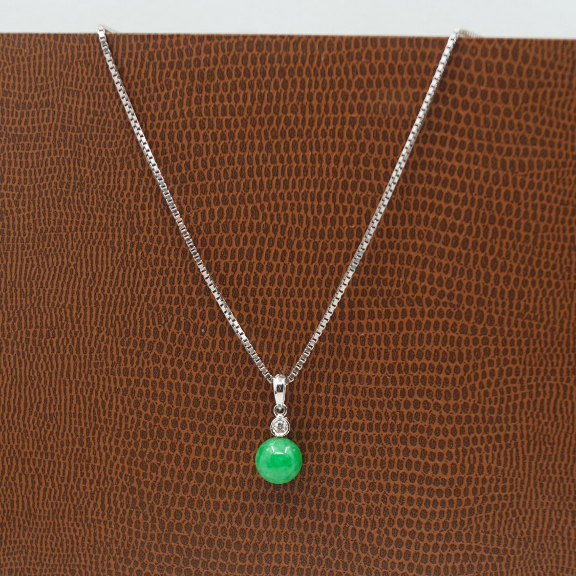 Hvidguldshalskæde af 14 kt. hvidguld med vedhæng i 18 kt. hvidguld prydet med jadeit og diamant, 0.07 ct.