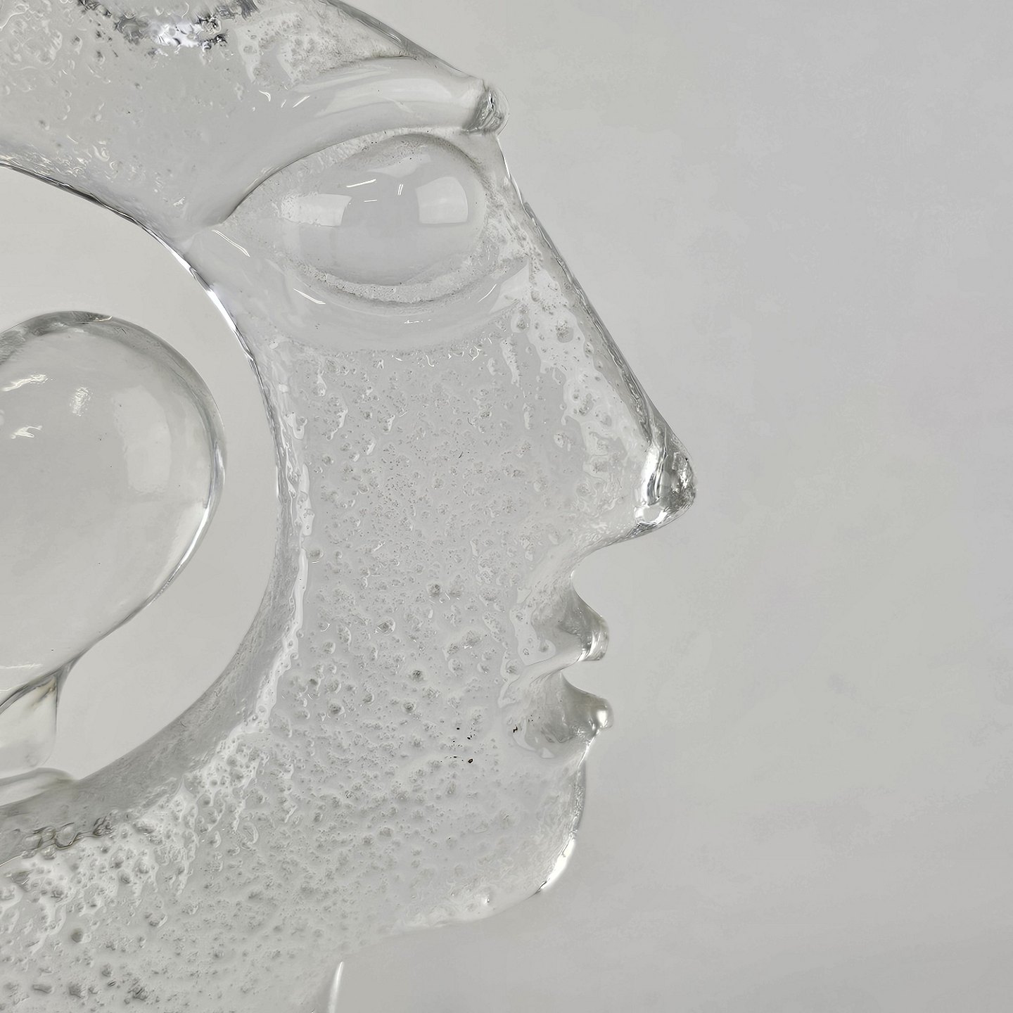 Skulptur i glas med motiv af et menneske i profil, en fugl og et hjerte