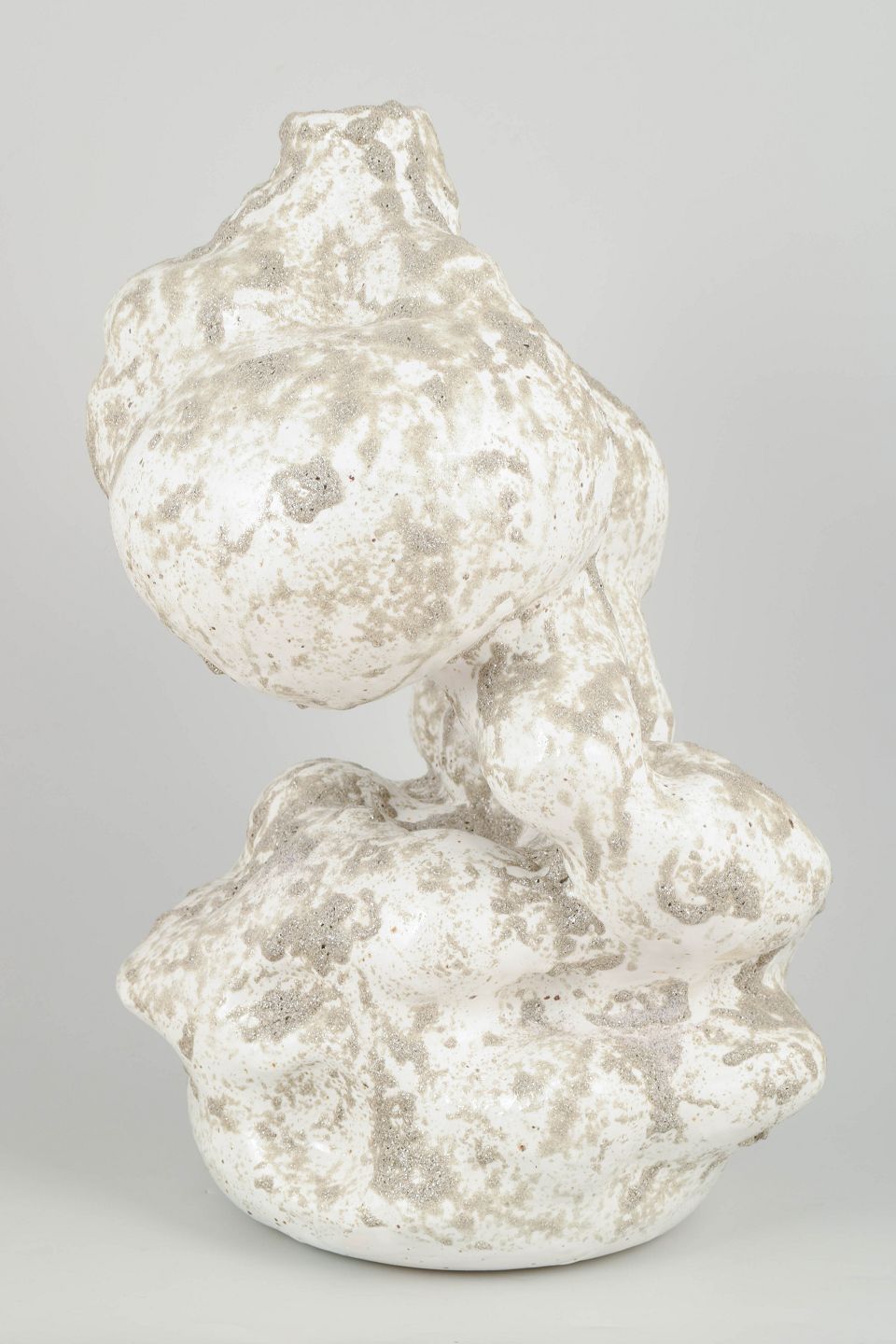 Høj unika stentøjsvase, organisk formet. Glasuren er en hvid blank med grå, mat glitter glasur, der henleder tankerne på vådt sand.