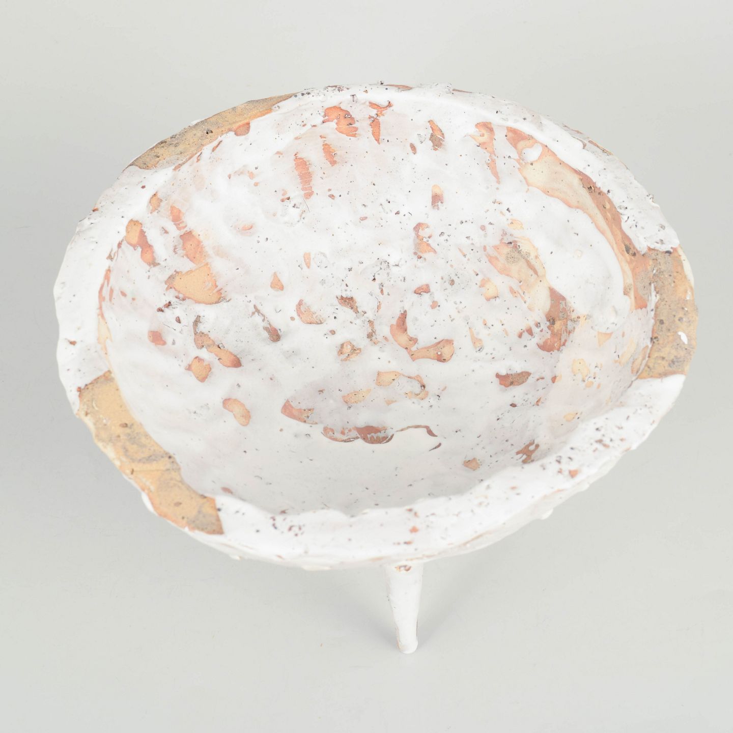 Unika Skål i genbrugt stentøjsler på tre spidse ben. Delvist glaseret fremstår den med det gyldne, brune og hvide områder. De brune områder er ler fra Danmark.