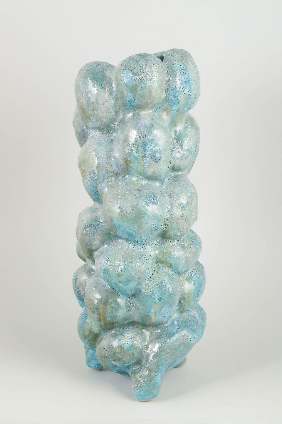Høj, slank unika stentøjsvase. Glasuren er en grønlig turkis med blå toner og tekstureret overflade. Vasen står på tre integrerede fødder. Denne skulptur er en del af 'Salt' serien af Christina Muff.