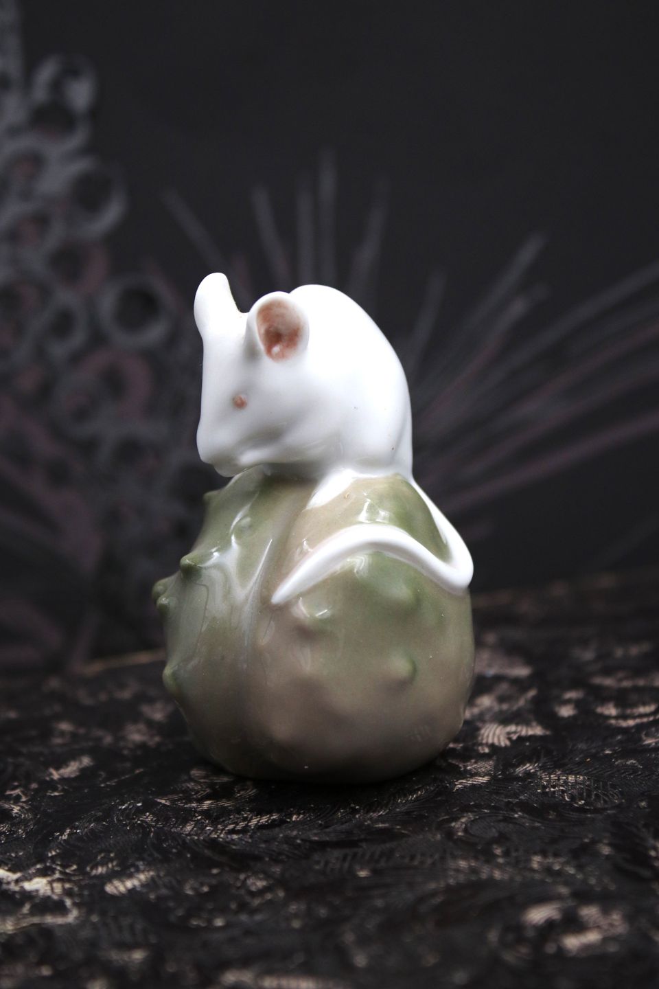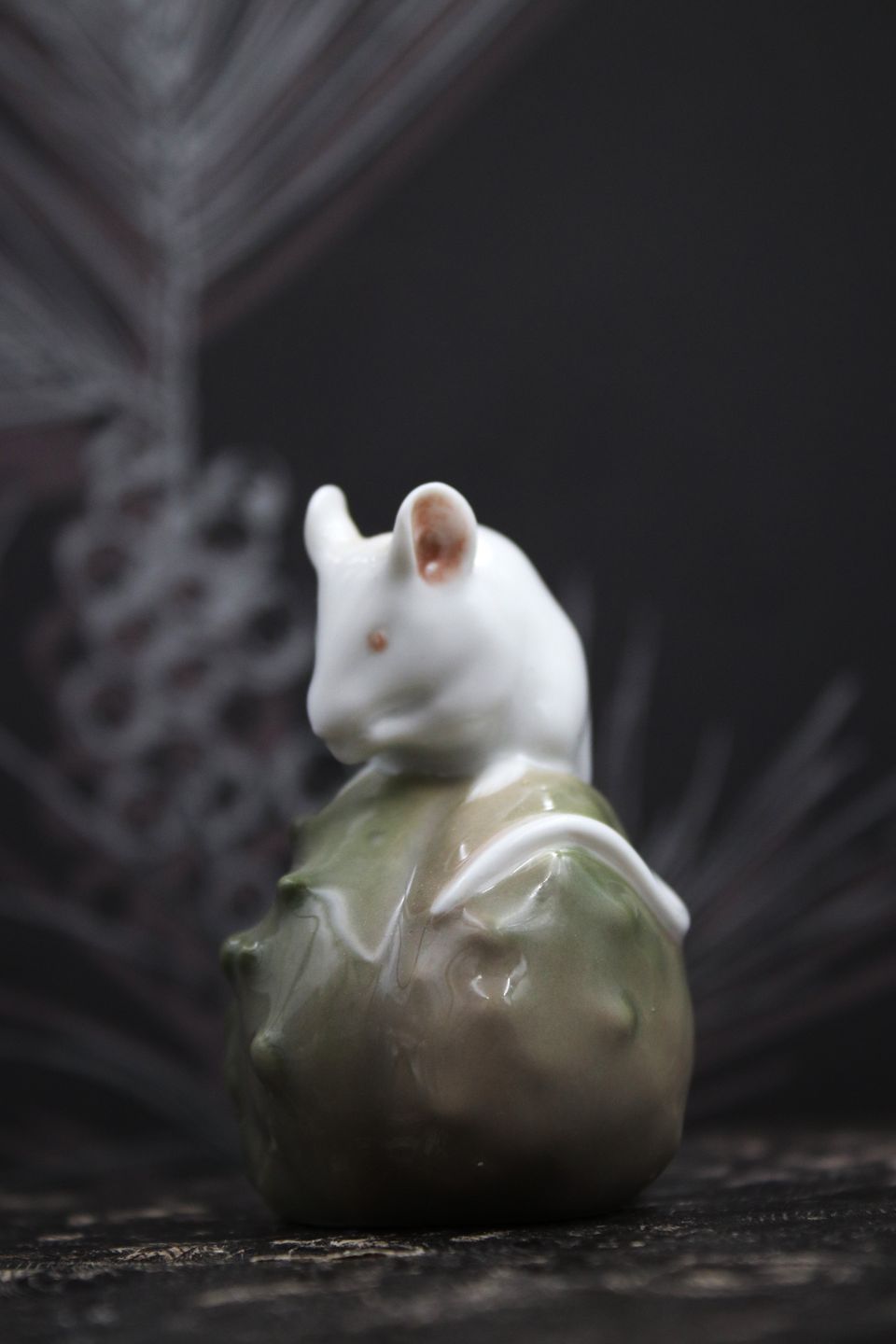 Lille hvid mus siddende på en kastanje , fin lille porcelænsfigur fra Royal Copenhagen...