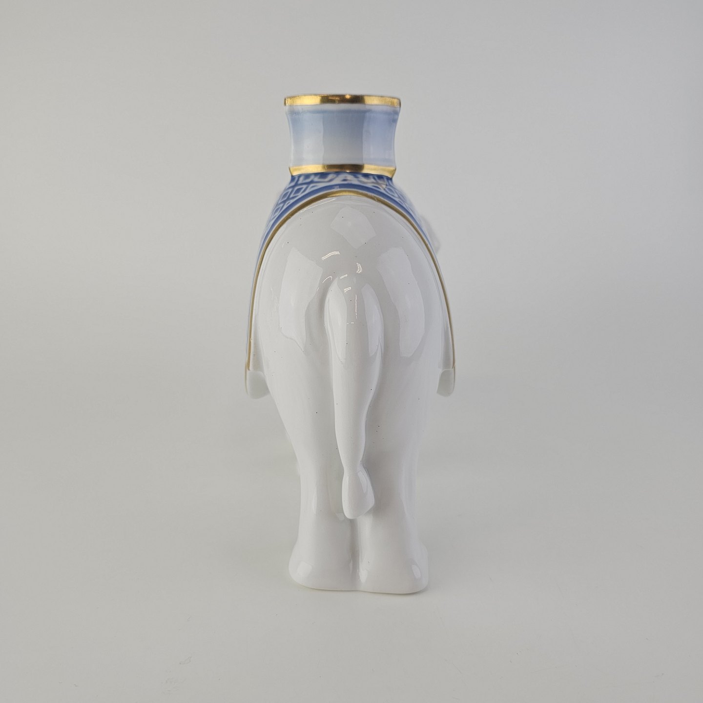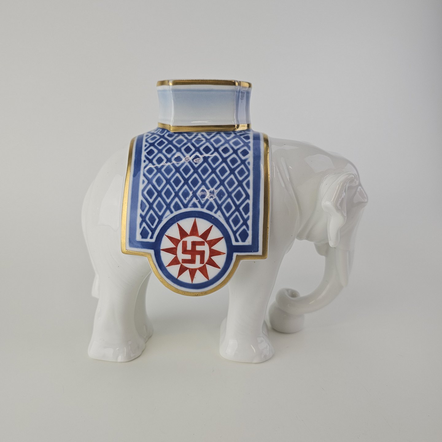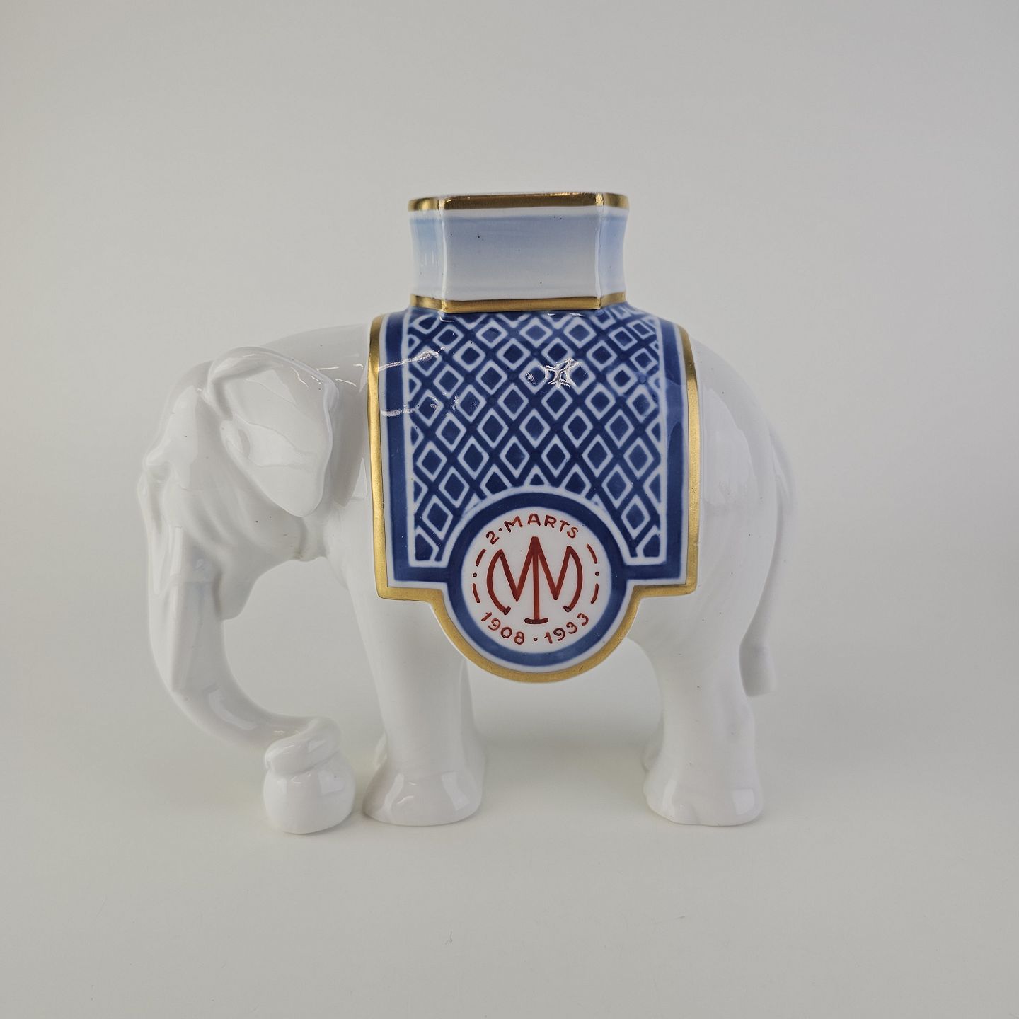 Figur i hvidt porcelæn med motiv af en elefant med teksten 2. marts 1908-1933 på den ene side. Lavet specielt til Carlsberg, brugt som gave derfra.
