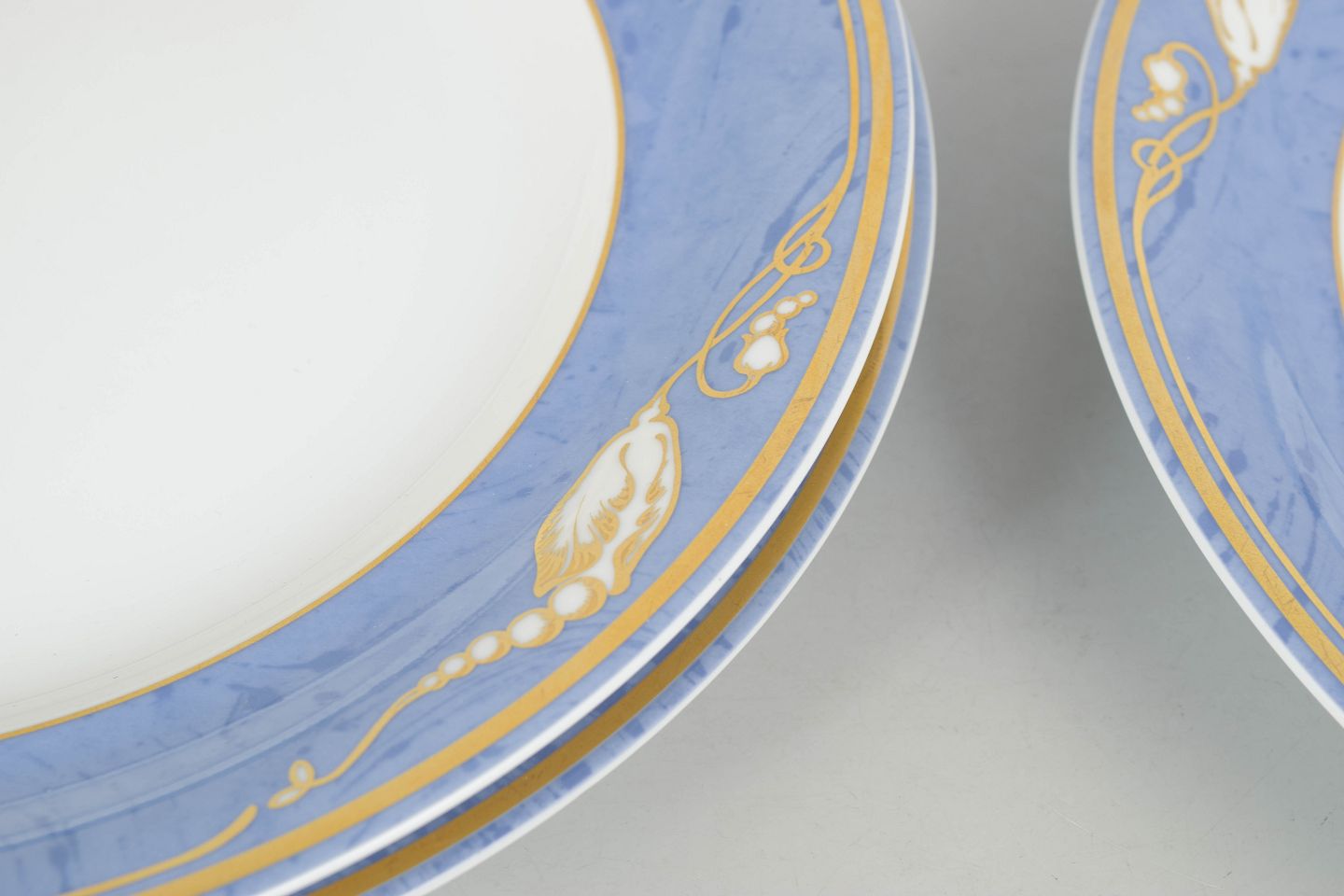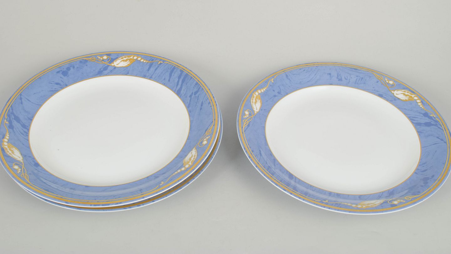 Elegante middagstallerkener i porcelæn med Blå Magnolia dekoration, model 627, fremstillet i 1990’erne. Første sortering og fabriksstemplet.