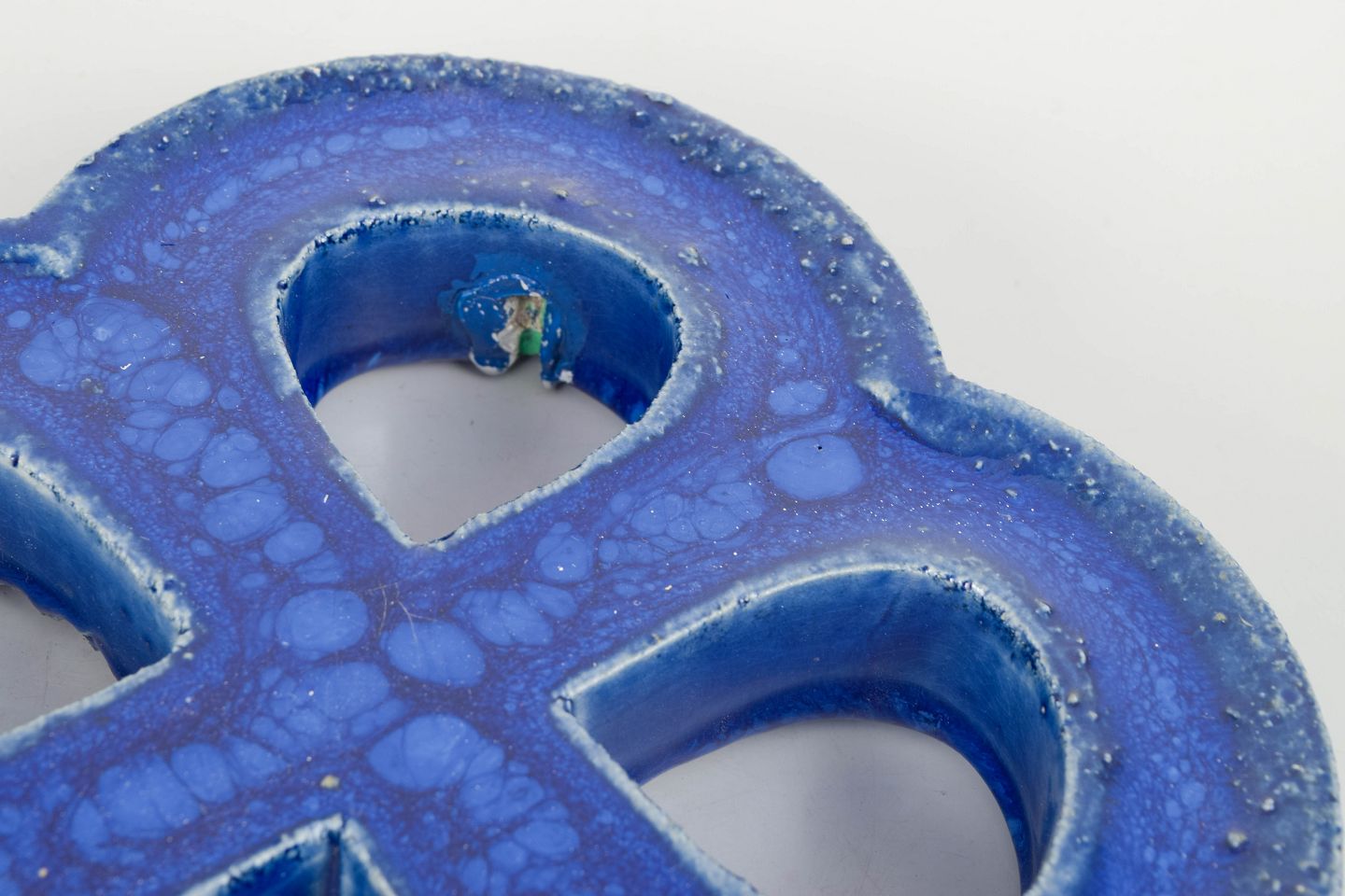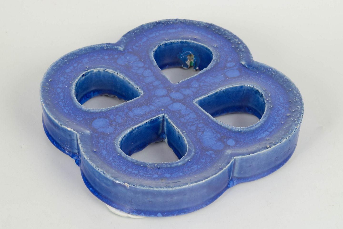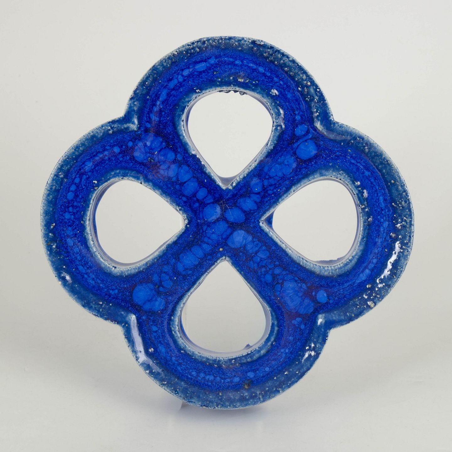 Dekorativt vægrelief i stentøj med organisk firkløverform og gennemgående åbninger. Udført med dyb blå, levende glasur med bobleeffekt og variation i overfladen. Bagside med hul til ophæng.