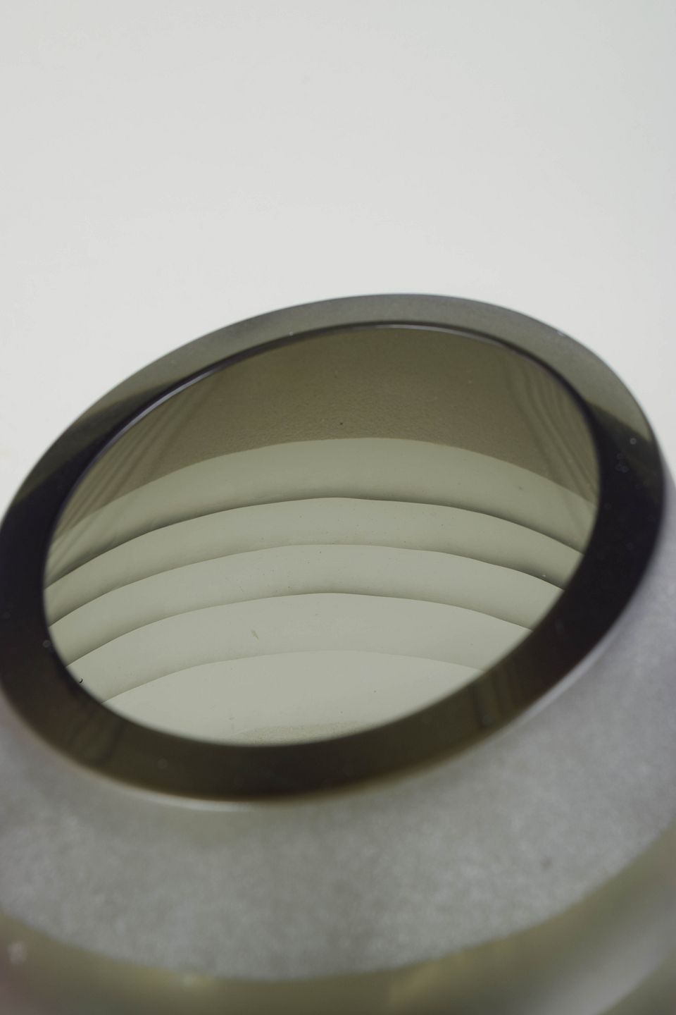 Skulpturel mundblæst glasvase med matteret overflade og lagdelte horisontale bånd i røggrønne og grå nuancer. Elegant organisk form med karakteristisk venetiansk glasbearbejdning.