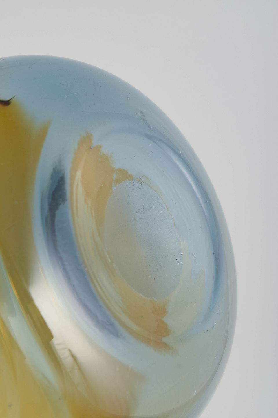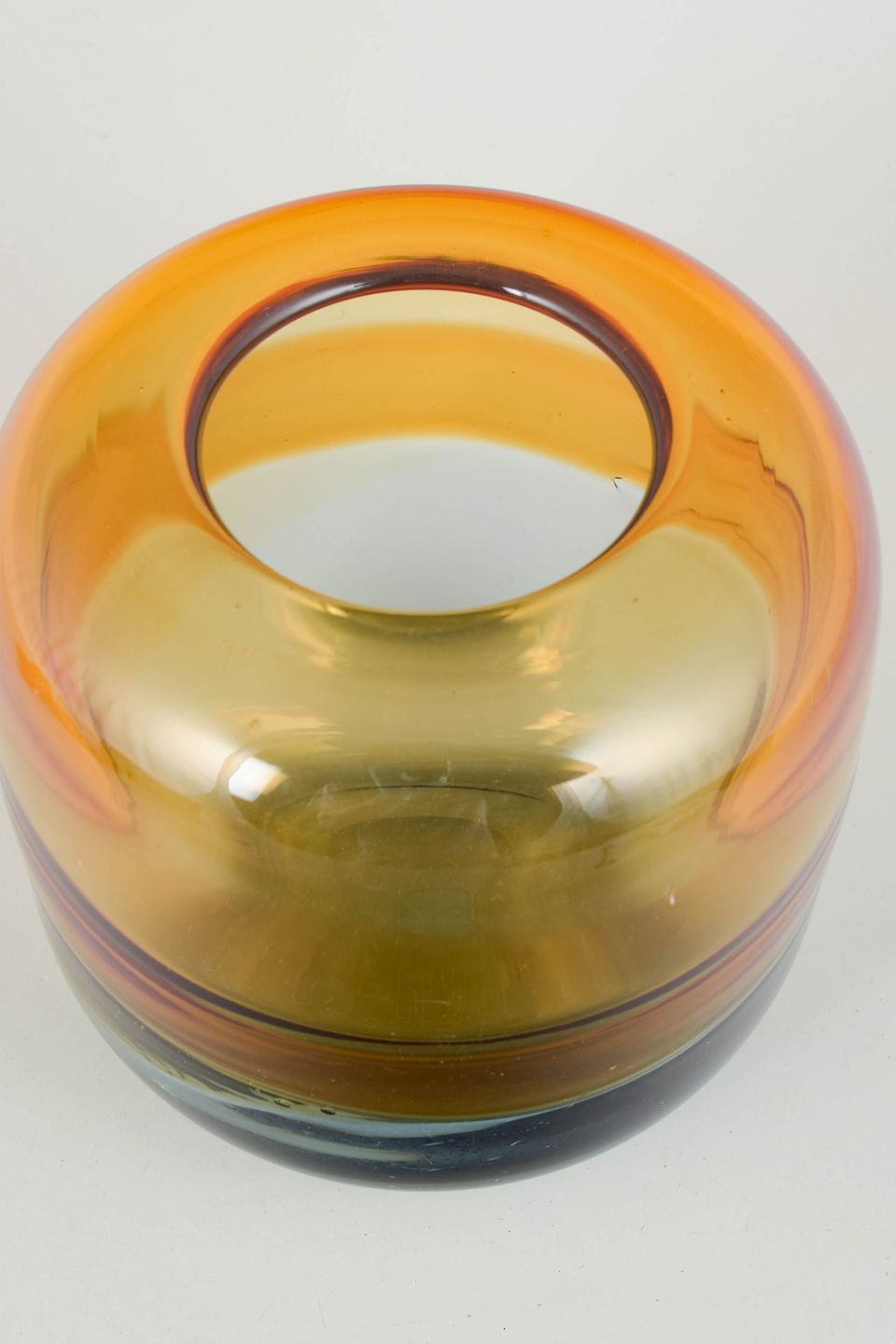 Kompakt vase i mundblæst glas med afrundet form og lagdelte farver i varme orange og gyldne toner over lys blå bund.