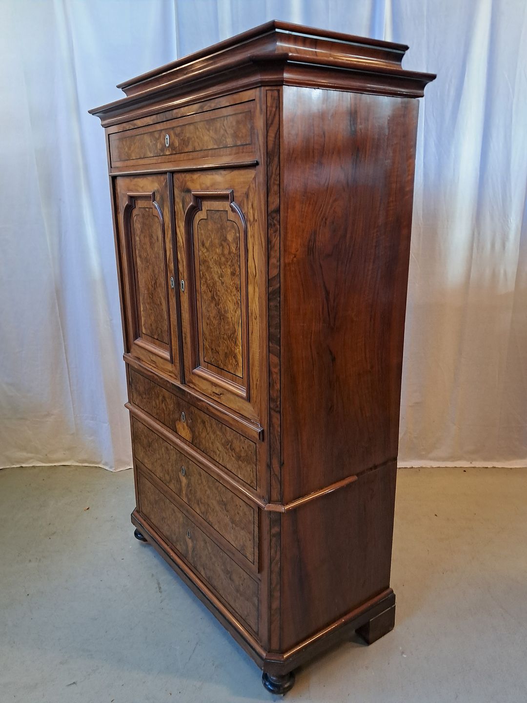 Skab i fineret mahogni og nøderod, fra 1900erne.