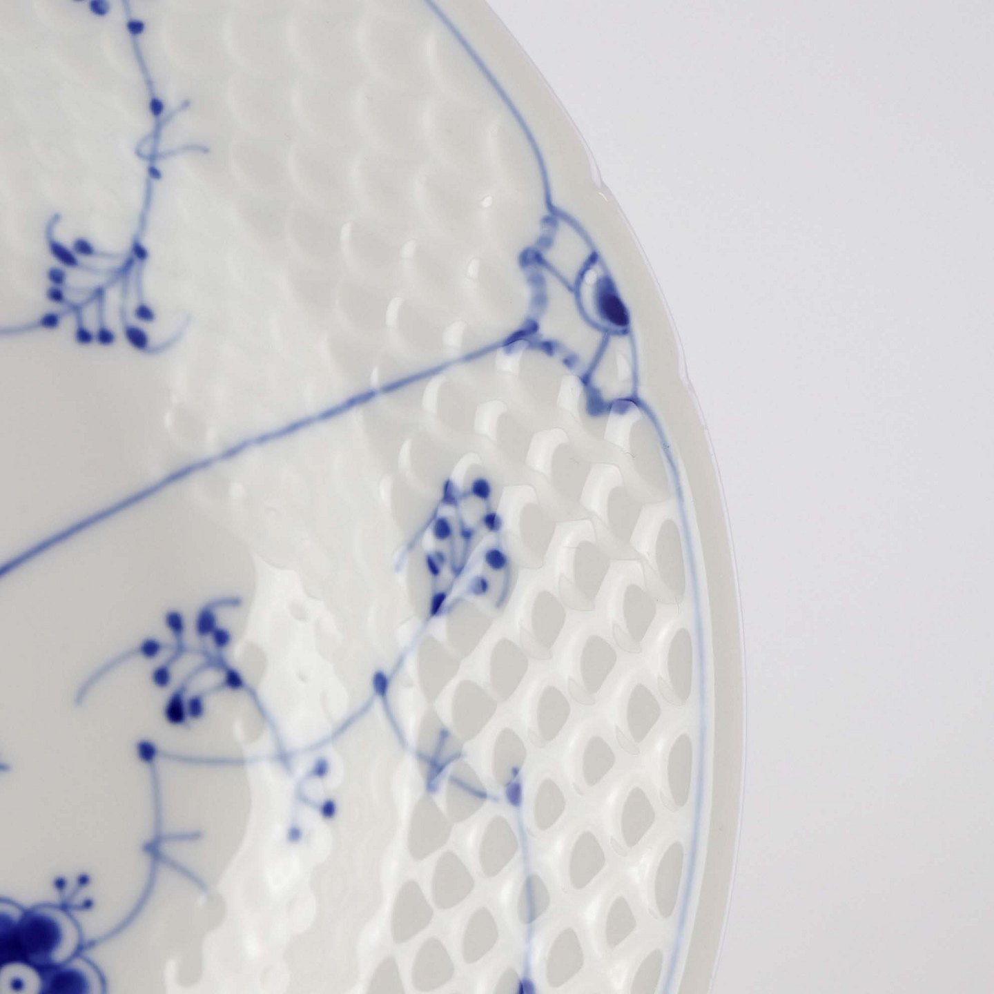 Service i hvid porcelæn med skelform og blå dekoration af blomsterranker.