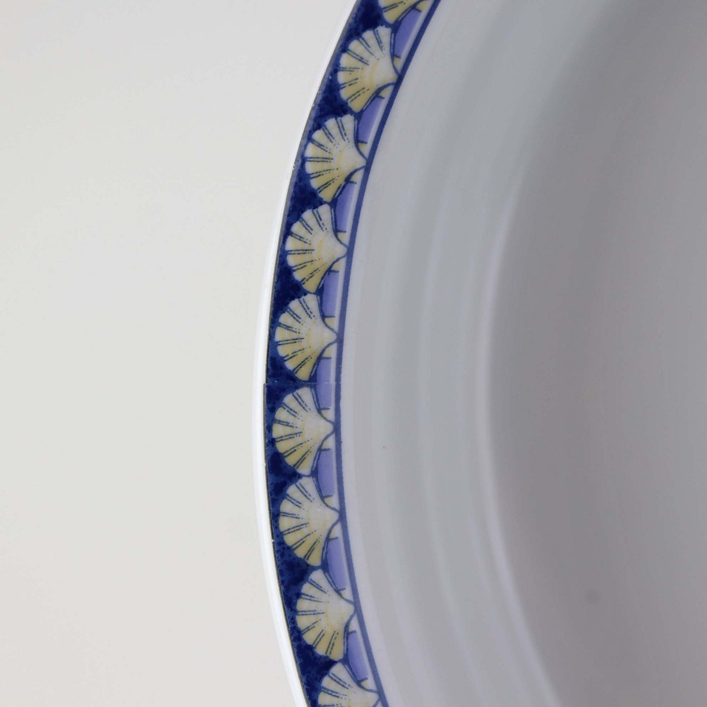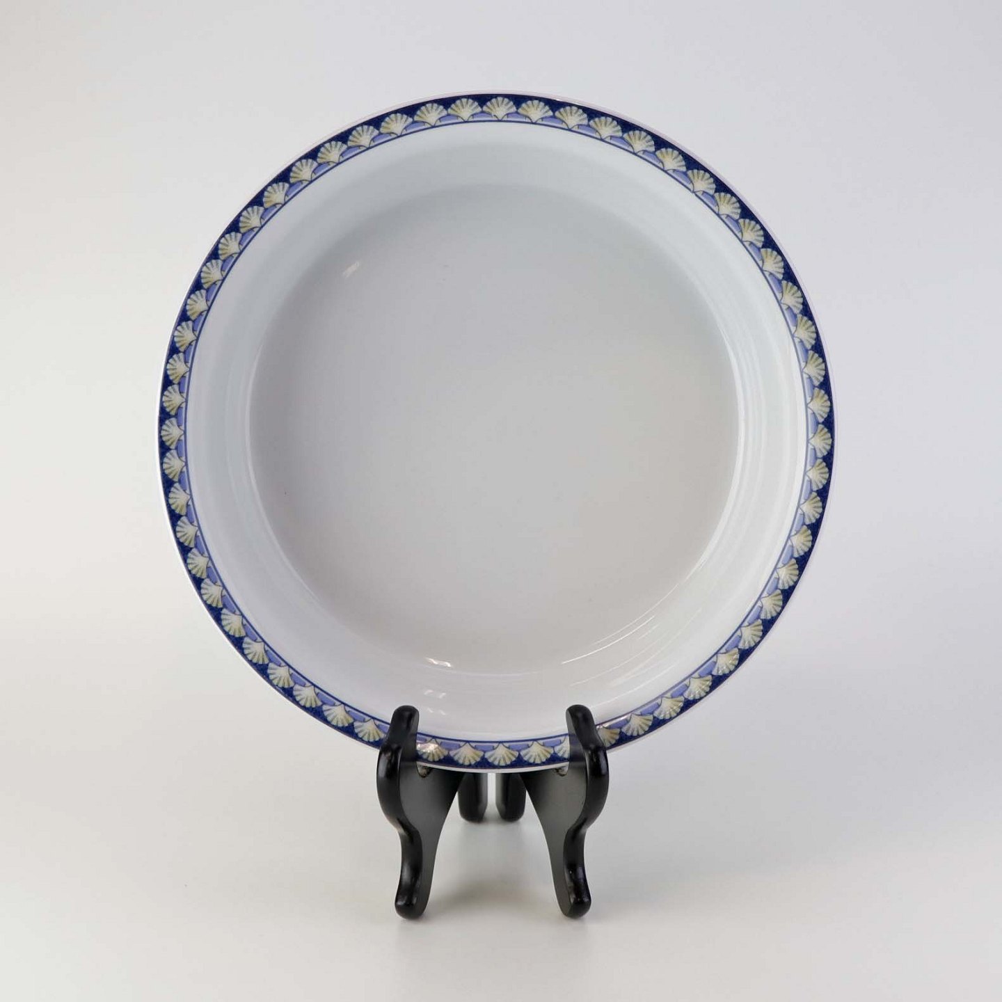 Service i glat hvid porcelæn med blåt bånd og dekoration af gule vifteformede strandskaller. Stellet kan gå i opvaskemaskinen.