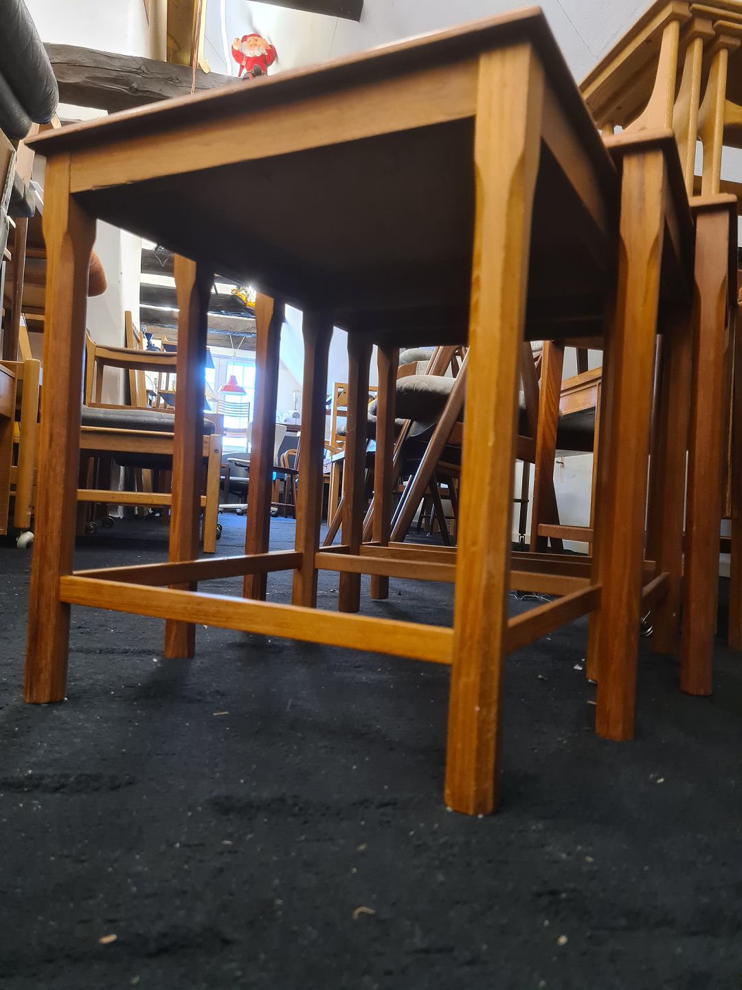 Indskudsborde fra 1970'erne i teak og med kakler. Fremstår pæne og stabile dog med bitte små afslag på kakler på det største bord.