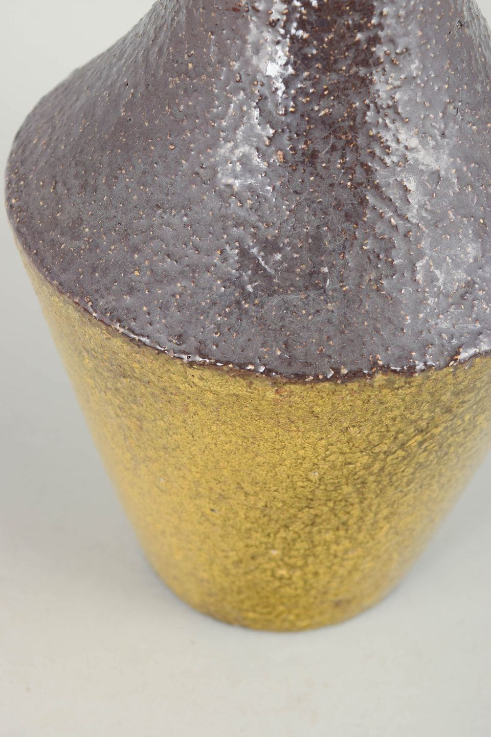 Elegant, høj vase i stentøj med slank form og karakteristisk tofarvet glasur i gul og brunviolette nuancer. Modellen 4330/676 fra 1960’erne fremstår med en raffineret overflade og klassisk skandinavisk formsprog.