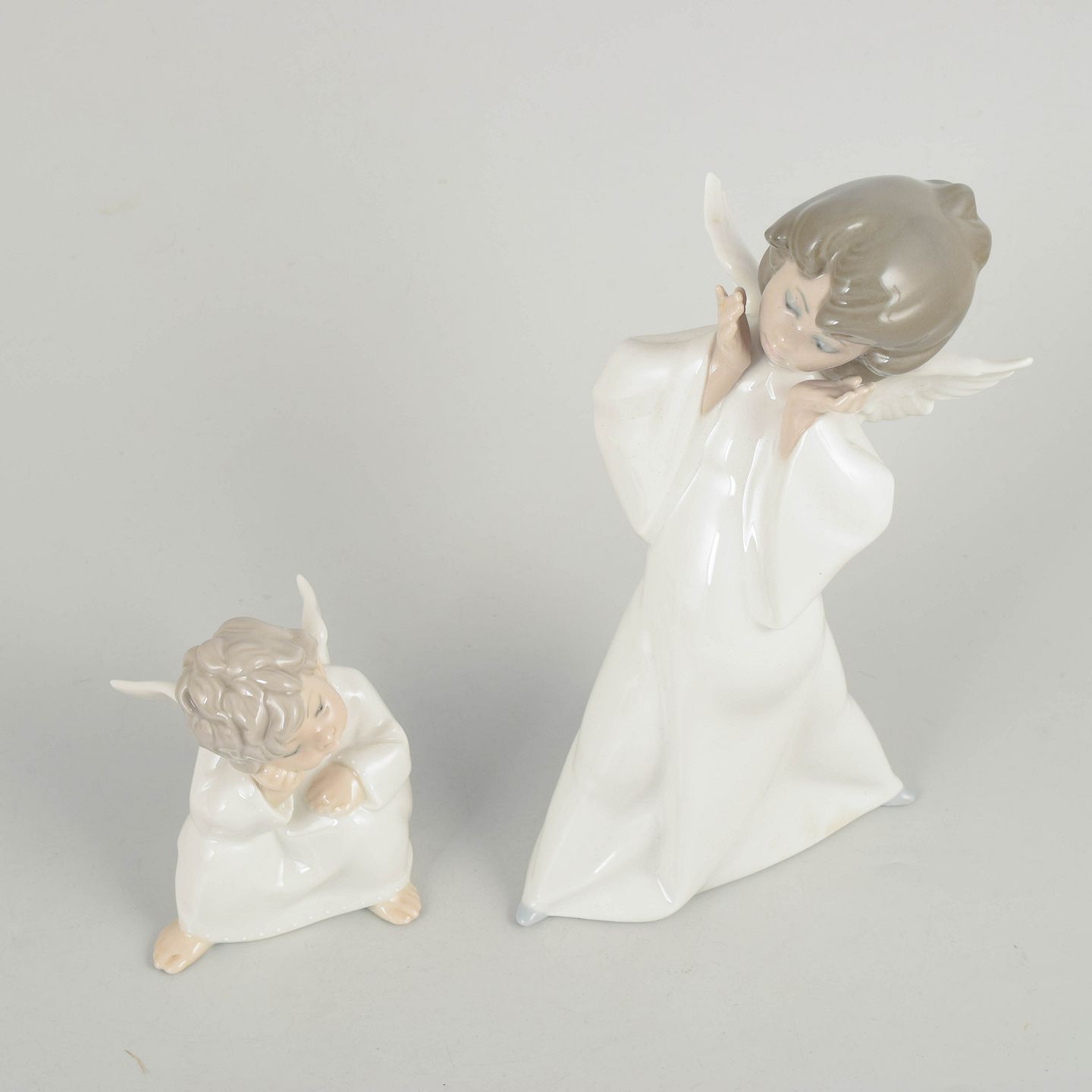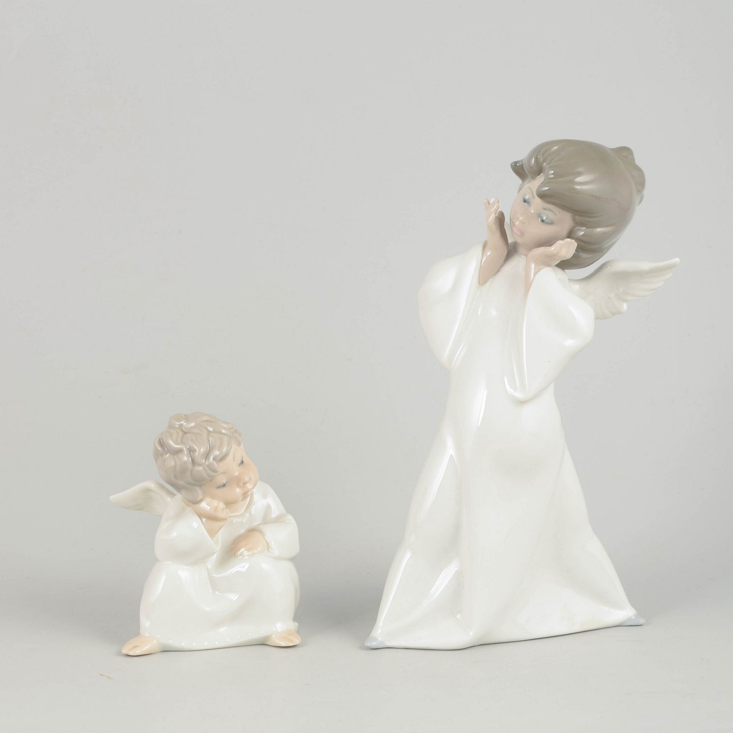 Two fine porcelain figurines depicting angels in classic Lladró style with soft forms and muted tones. One standing and one seated, both with detailed modelling and characteristic glaze.