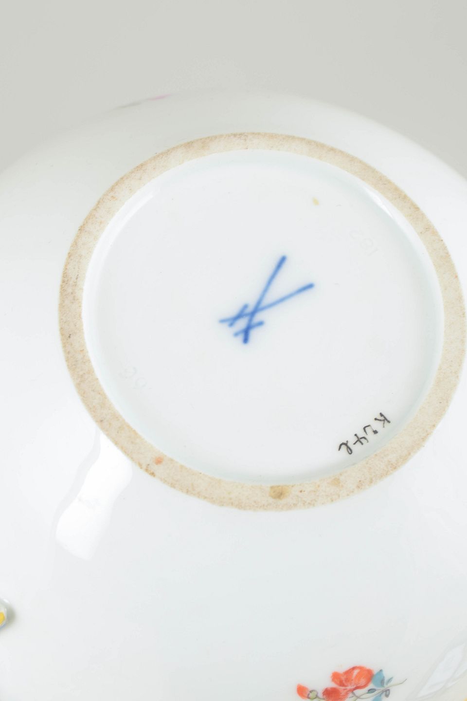 Tekande i porcelæn håndmalet med polykrome blomster og dekoreret med guldkant. Rund korpus med svungen tud og elegant hank samt låg med knop, udført i klassisk Meissen stil fra midten af det 20. århundrede. Undersiden mærket med Meissen krydssværd, første sortering.