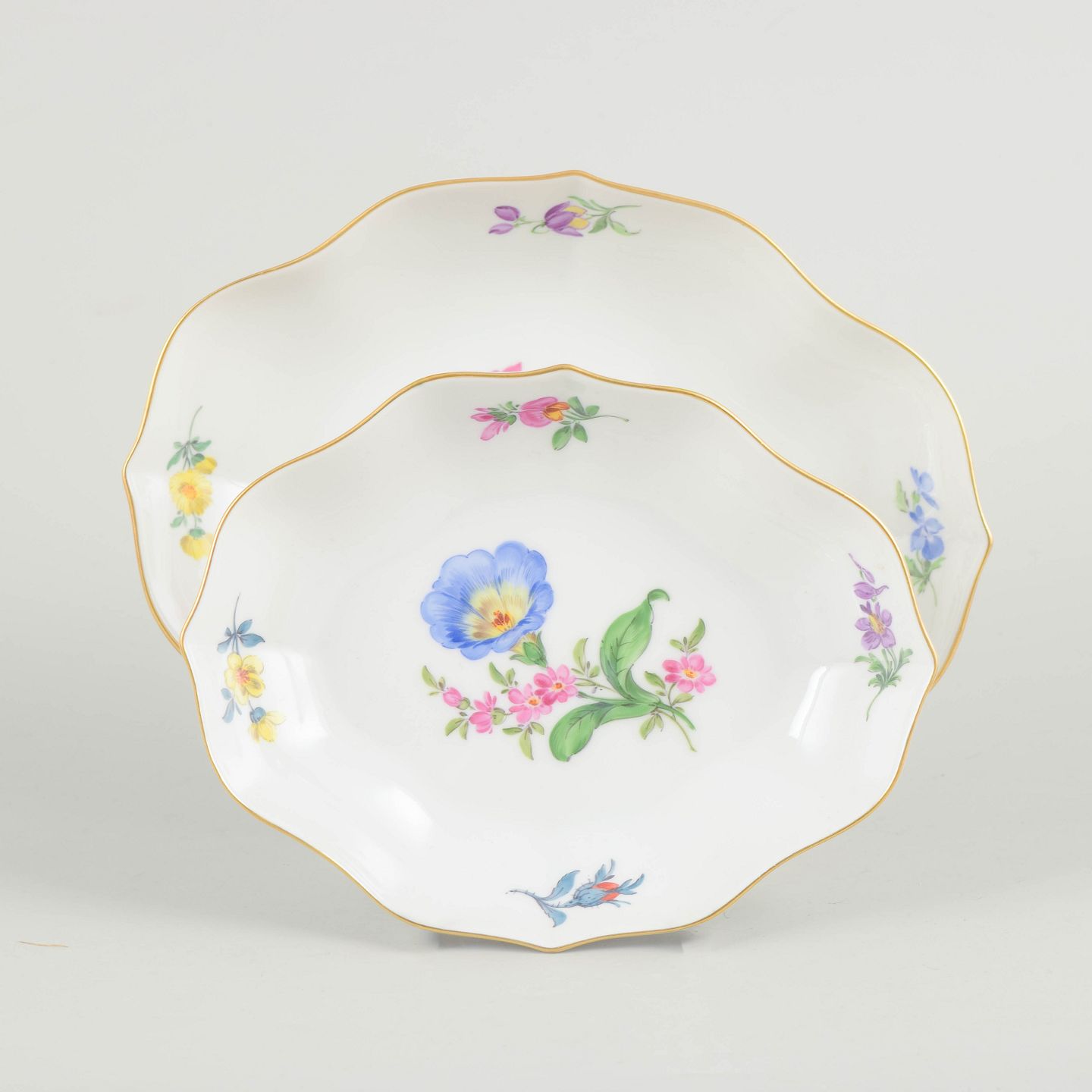 Sæt af to fade i porcelæn håndmalet med polykrome blomster og dekoreret med guldkant. Klassiske Meissen former med let bølget rand fra midten af det 20. århundrede. Begge mærket med Meissen krydssværd, hvoraf det ene er første sortering og det andet tredje sortering.