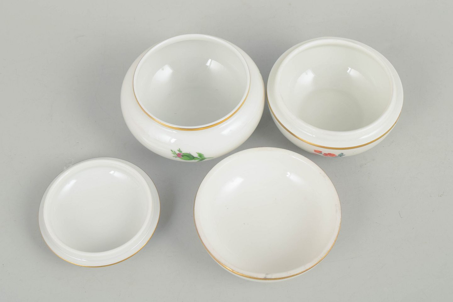 Set of two porcelain lidded jars hand painted with polychrome flowers and decorated with gilt bands. Classic Meissen forms from the mid 20th century with well-fitted lids and elegant rounded profiles. Both marked with Meissen crossed swords, one in first factory quality and the other cancelled with two incised lines.