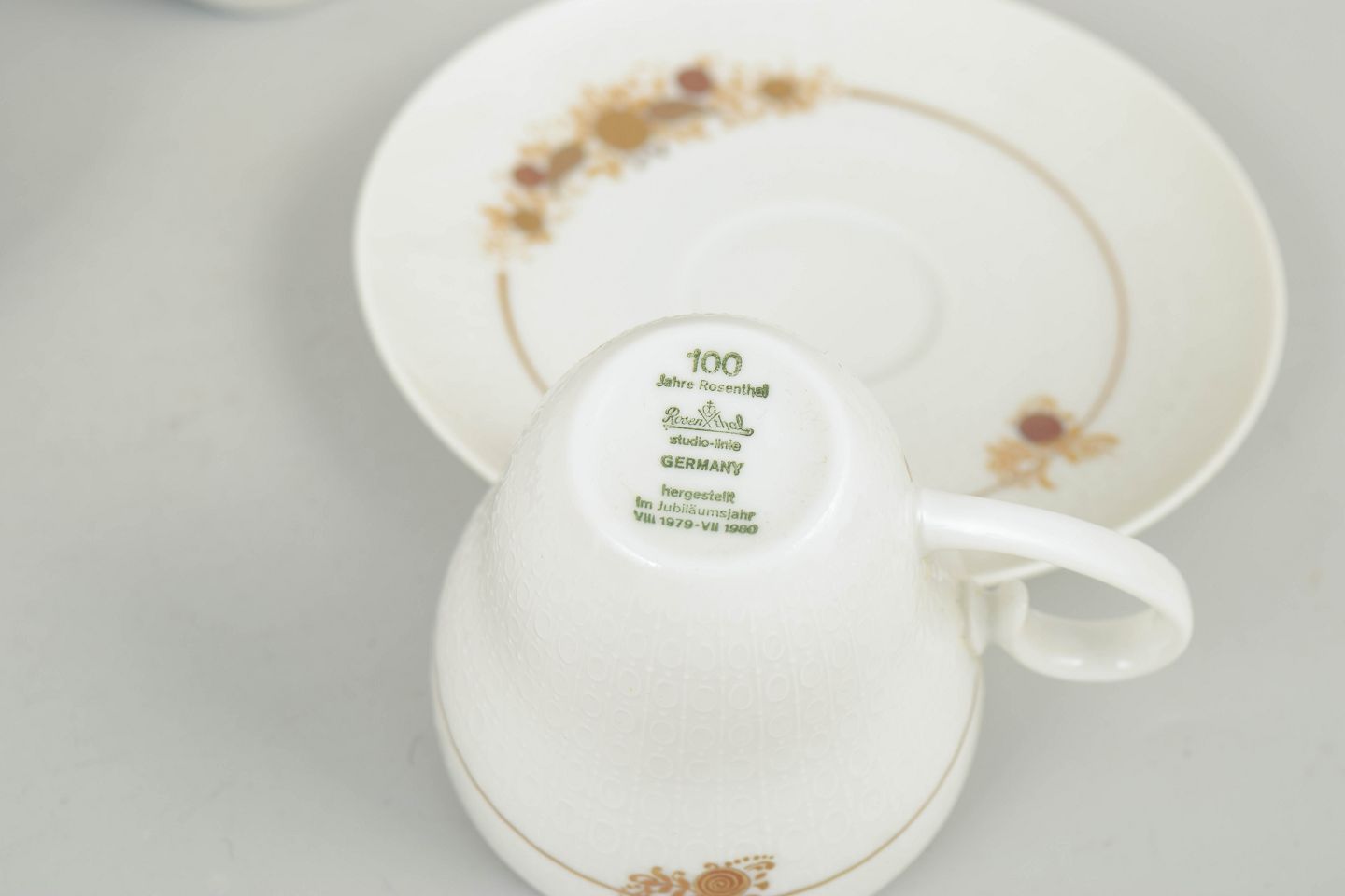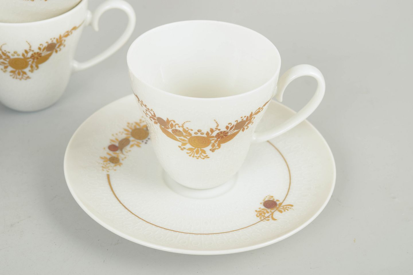 Set consisting of four coffee cups with matching saucers in porcelain decorated with the characteristic floral ornament from the Romanze series. The decoration appears in golden tones with fine detailing and an elegant, romantic expression, typical of Wiinblad’s design language in the 1970s.
