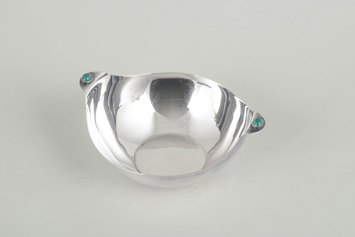 Organisk formet skål i poleret sterlingsølv, afsluttet med små grønne jade sten monteret på kanten. Elegant modernistisk udtryk med bløde linjer og raffineret detaljering.