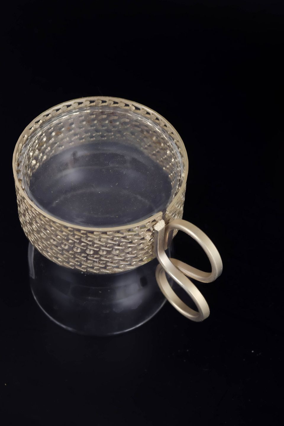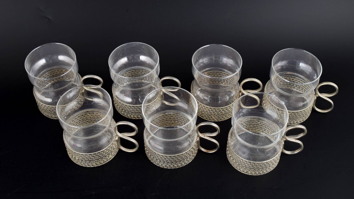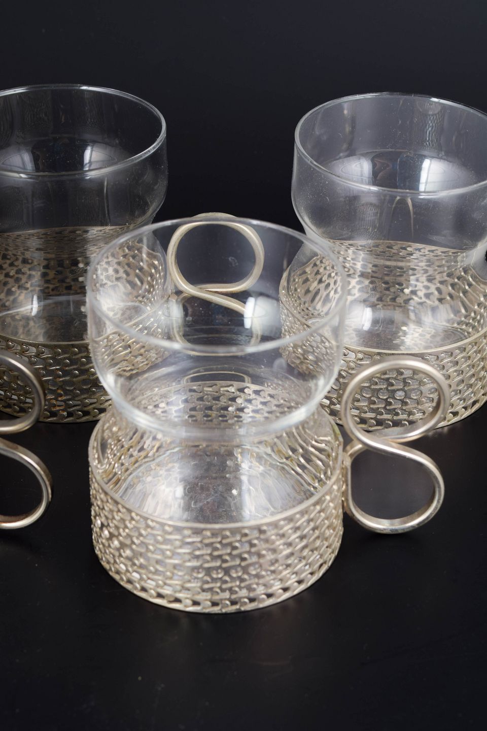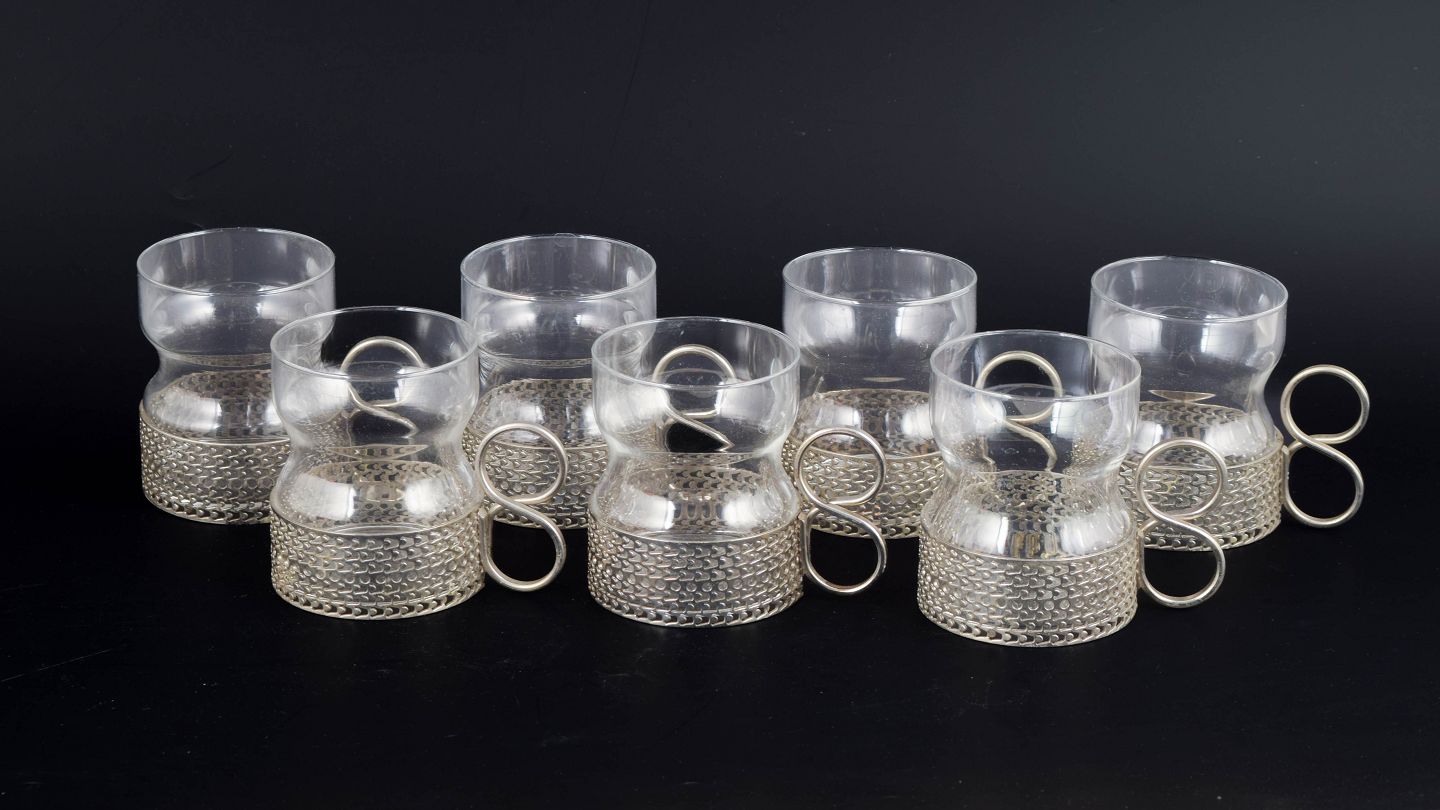 Karakteristiske teglas fra Tsaikka-serien i klart glas med tilhørende metalholdere og hank, velegnet til te eller varm drik, designet i 1970’erne.