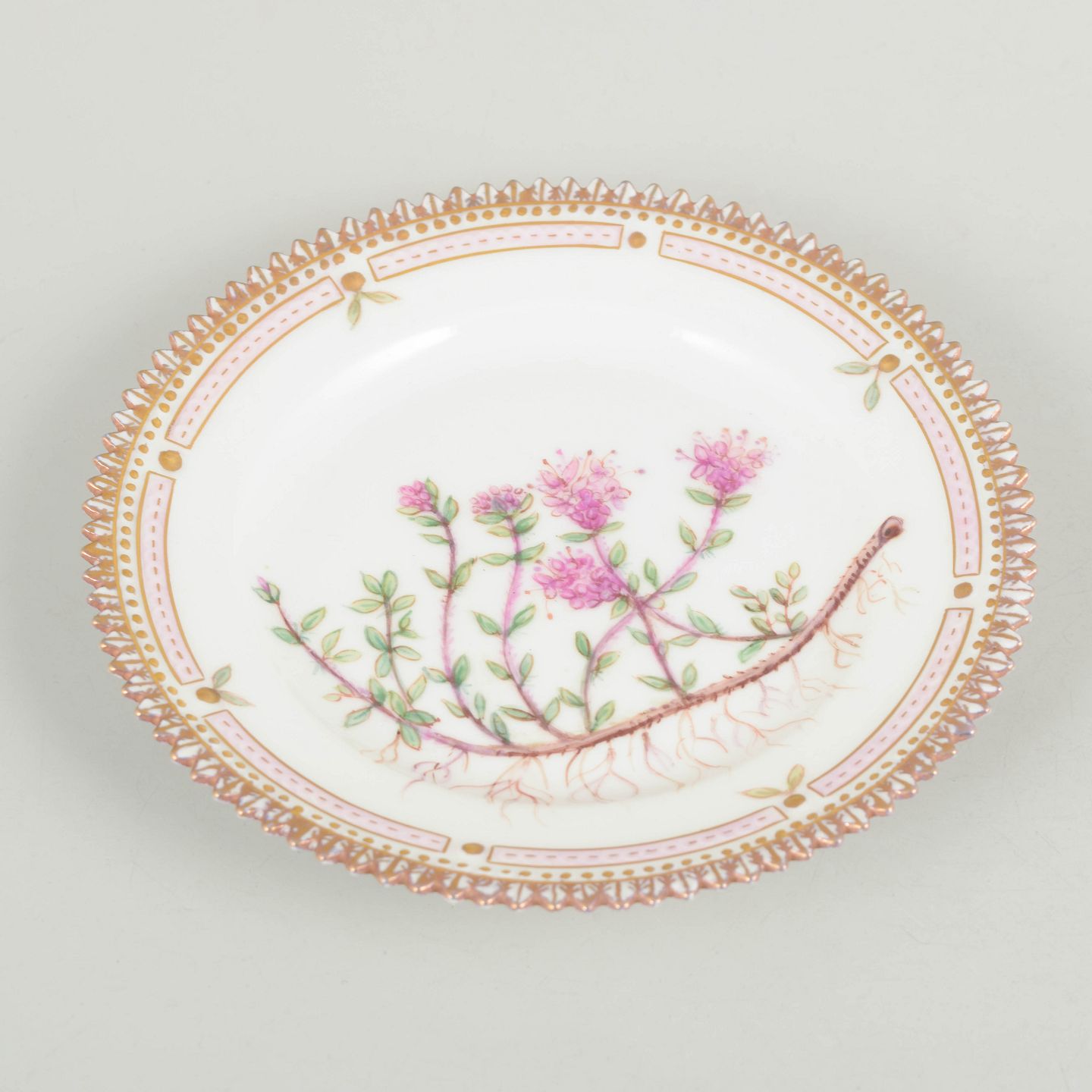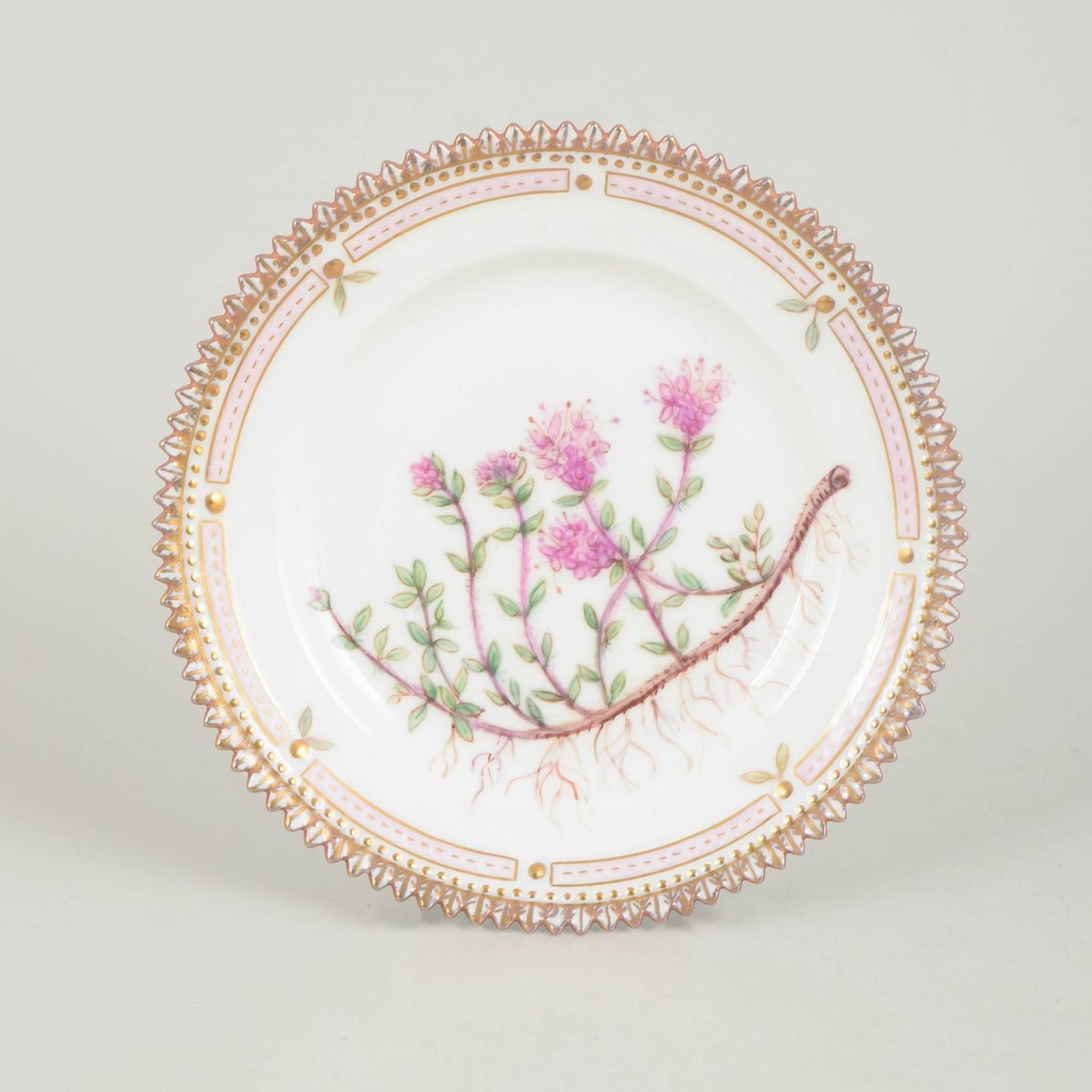 Hånddekoreret porcelænstallerken med botanisk motiv fra Flora Danica-serien, hjemmedekoreret, fint udført med forgyldt rand og detaljerig gengivelse af planter.