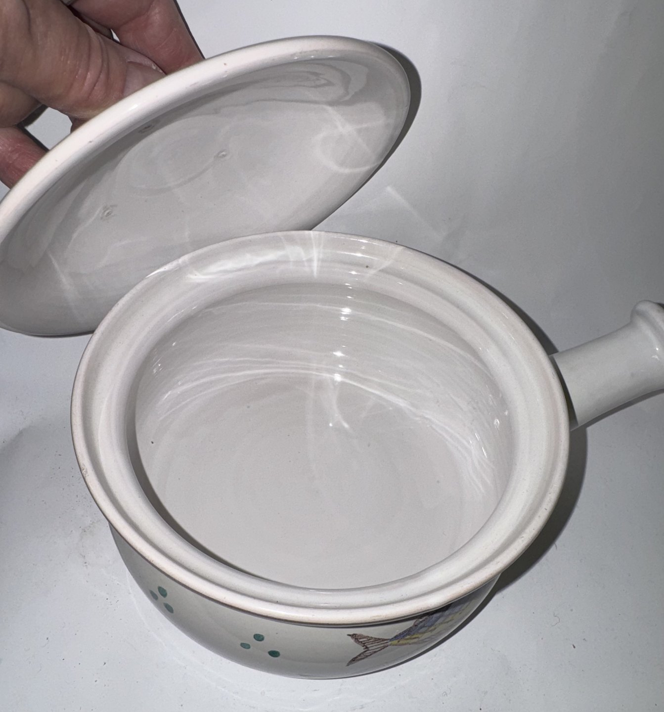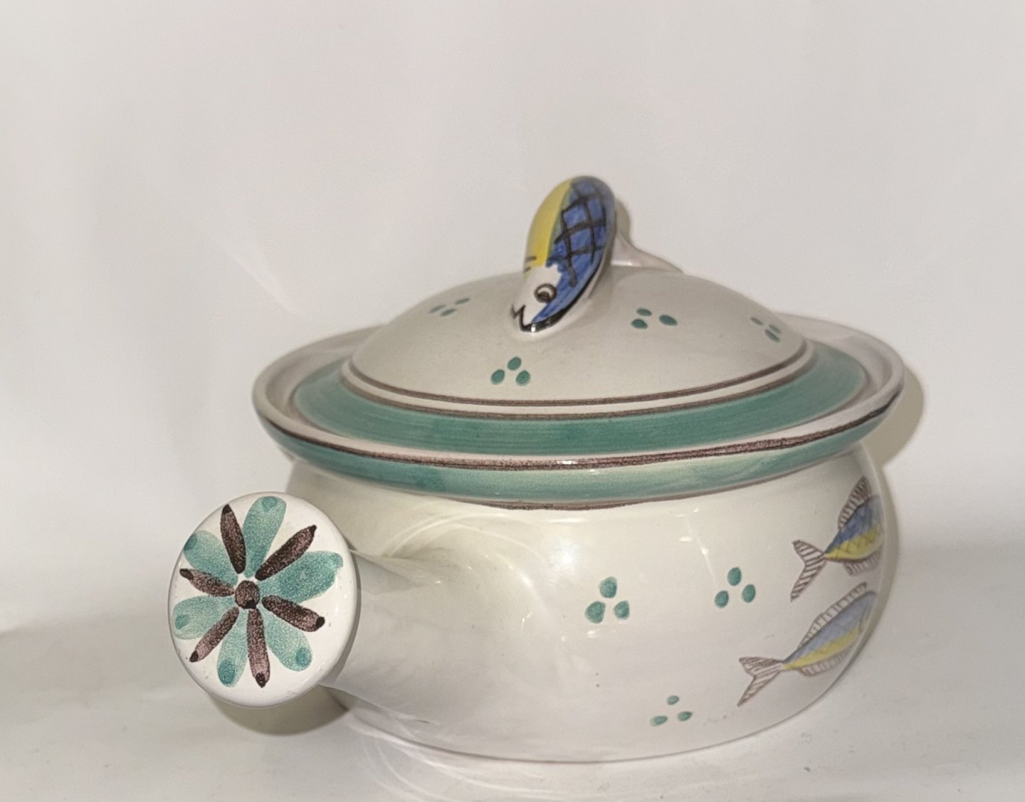 SKÅL TIL JULESILD, påskesild og hverdagssild - Skål med låg og håndtag i keramik fra Lars Syberg keramik værksted. Dekoreret med bemalede sild og figur af sild som lågknop. Fabriksmærket på bunden. Mål: H. 13 cm L. 23,5 cm d. 16,8 cm