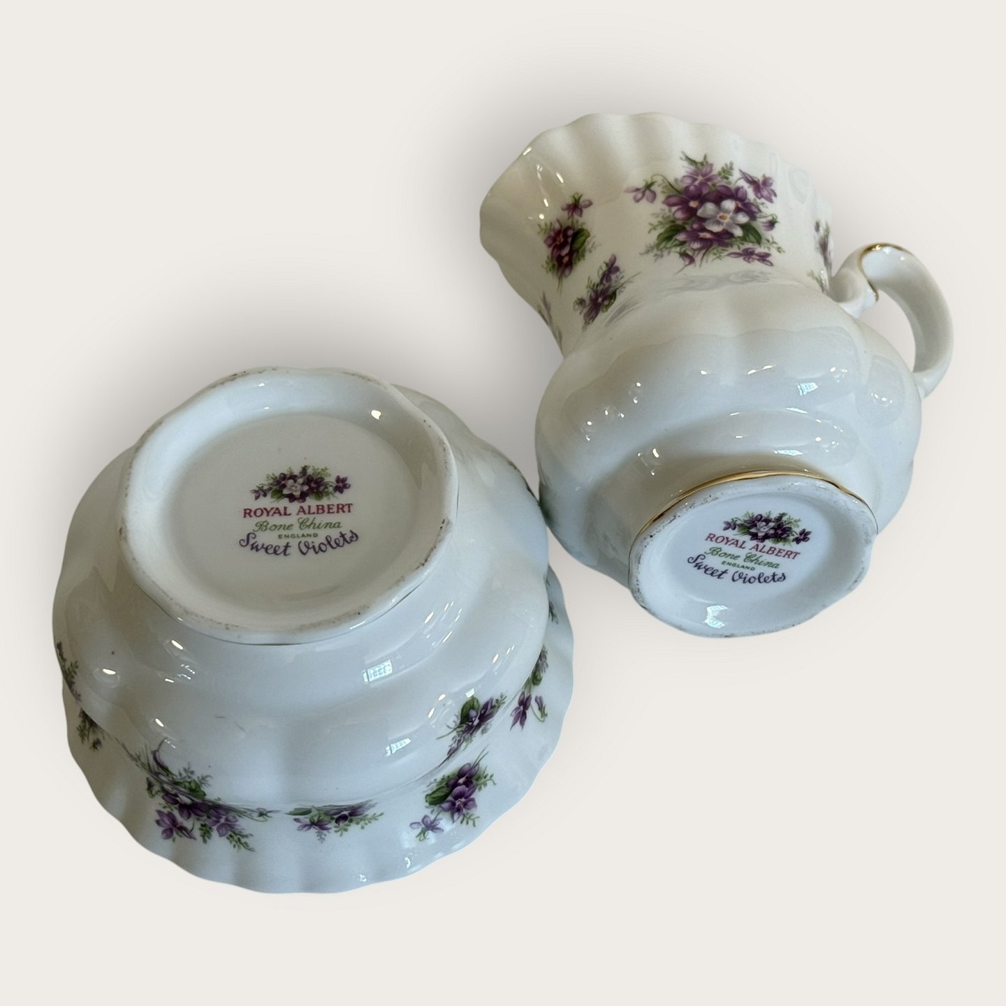 Royal Albert, Bone China, Sweet violets, Mark viol, Sukker, flødesæt, diameter sukkerskål 9cm, flødekande højde 9cm *Perfekt stand*