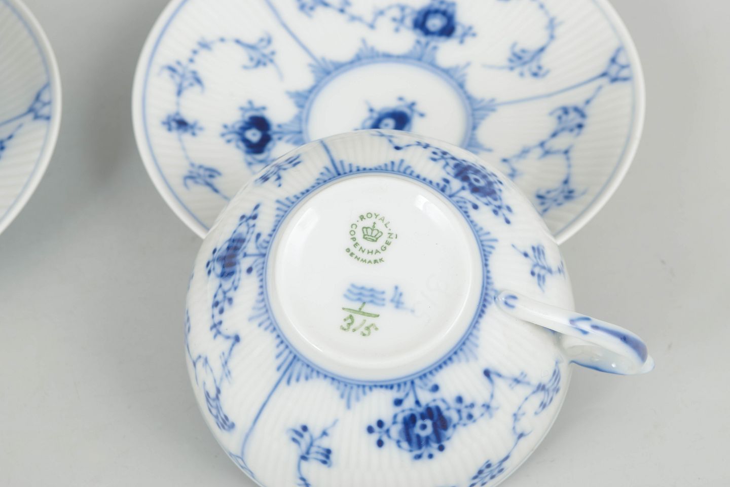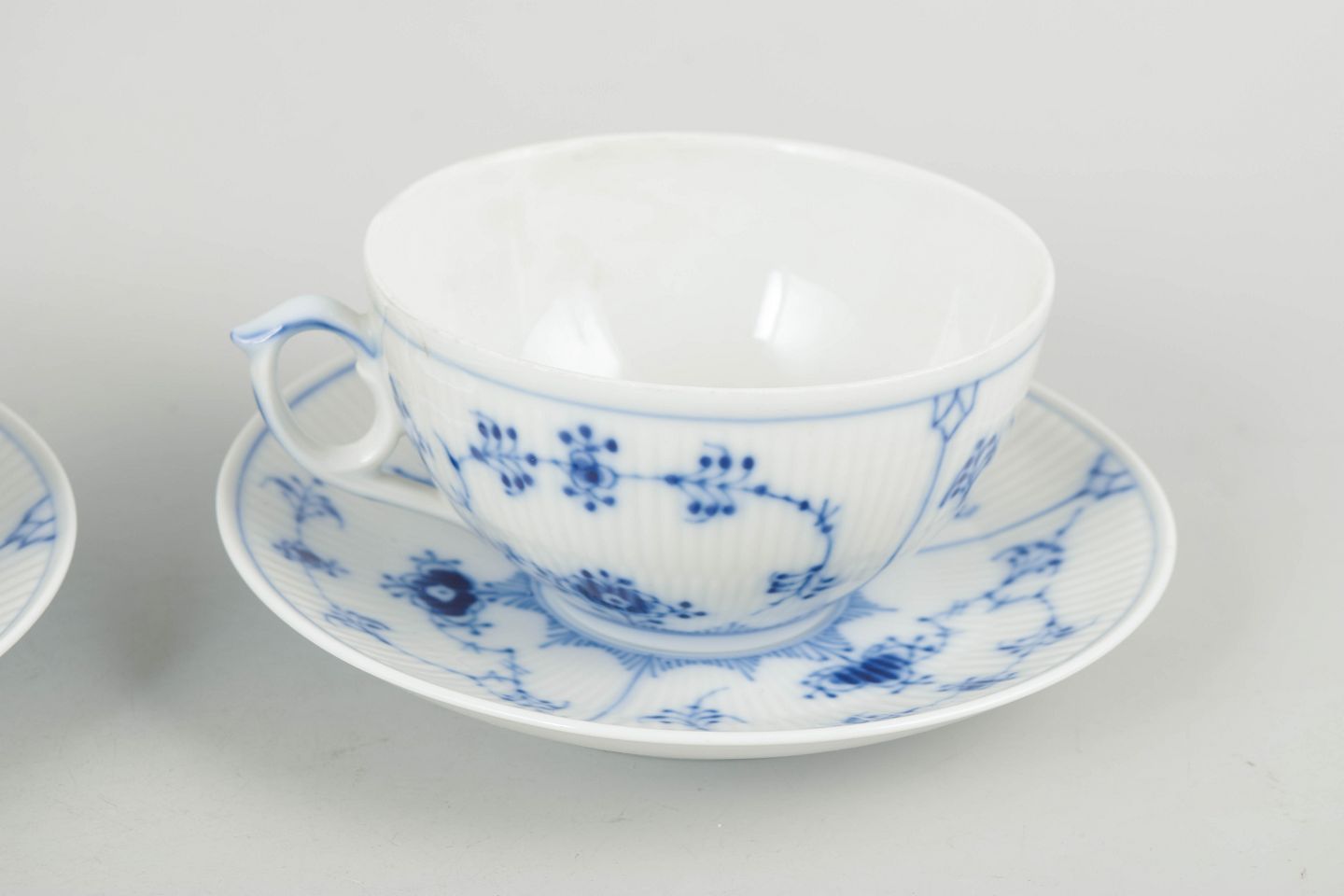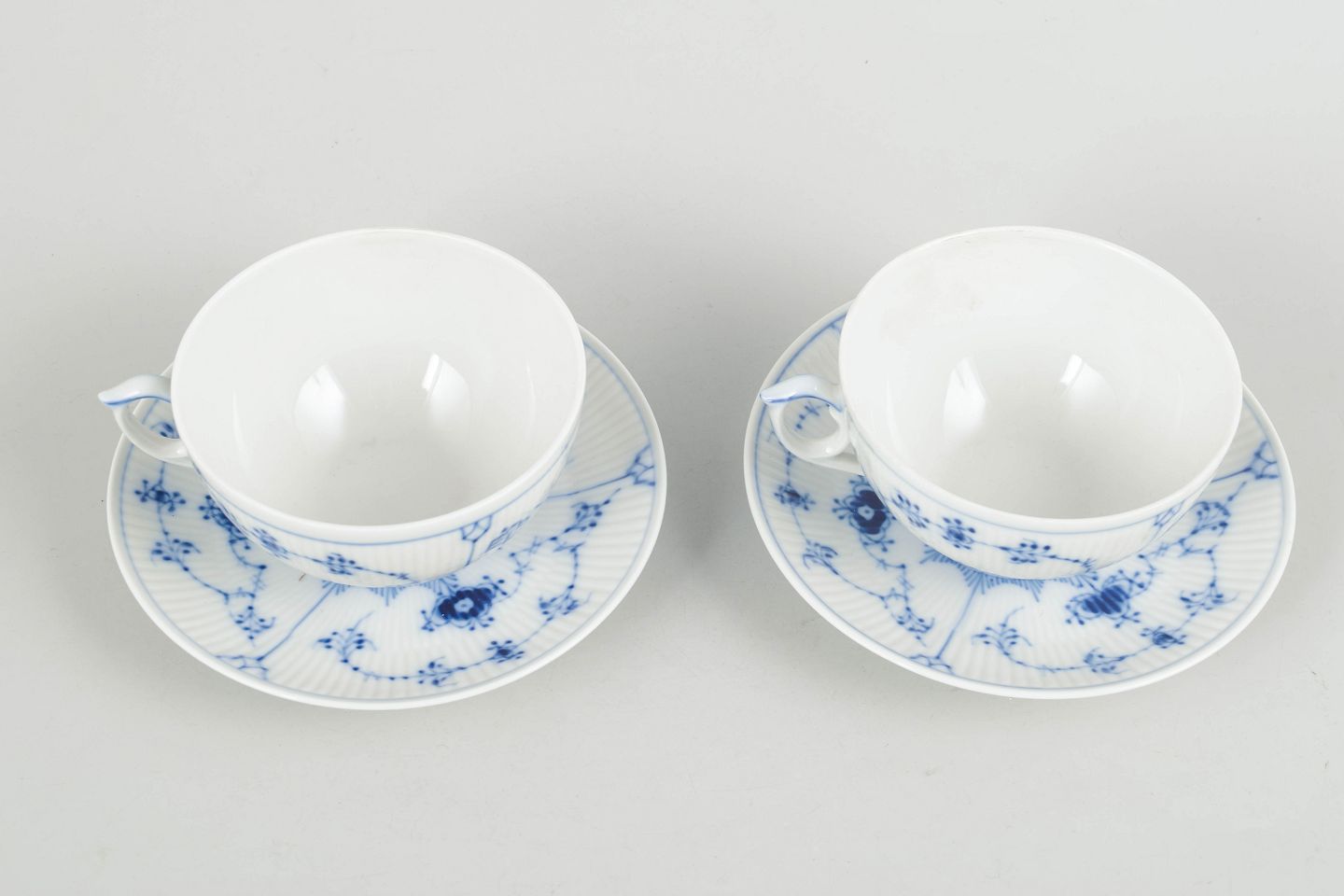To tekopper med tilhørende underkopper i porcelæn med håndmalet dekoration i underglasurblå i det klassiske Musselmalet Riflet mønster. Model 1/315. Første sortering.