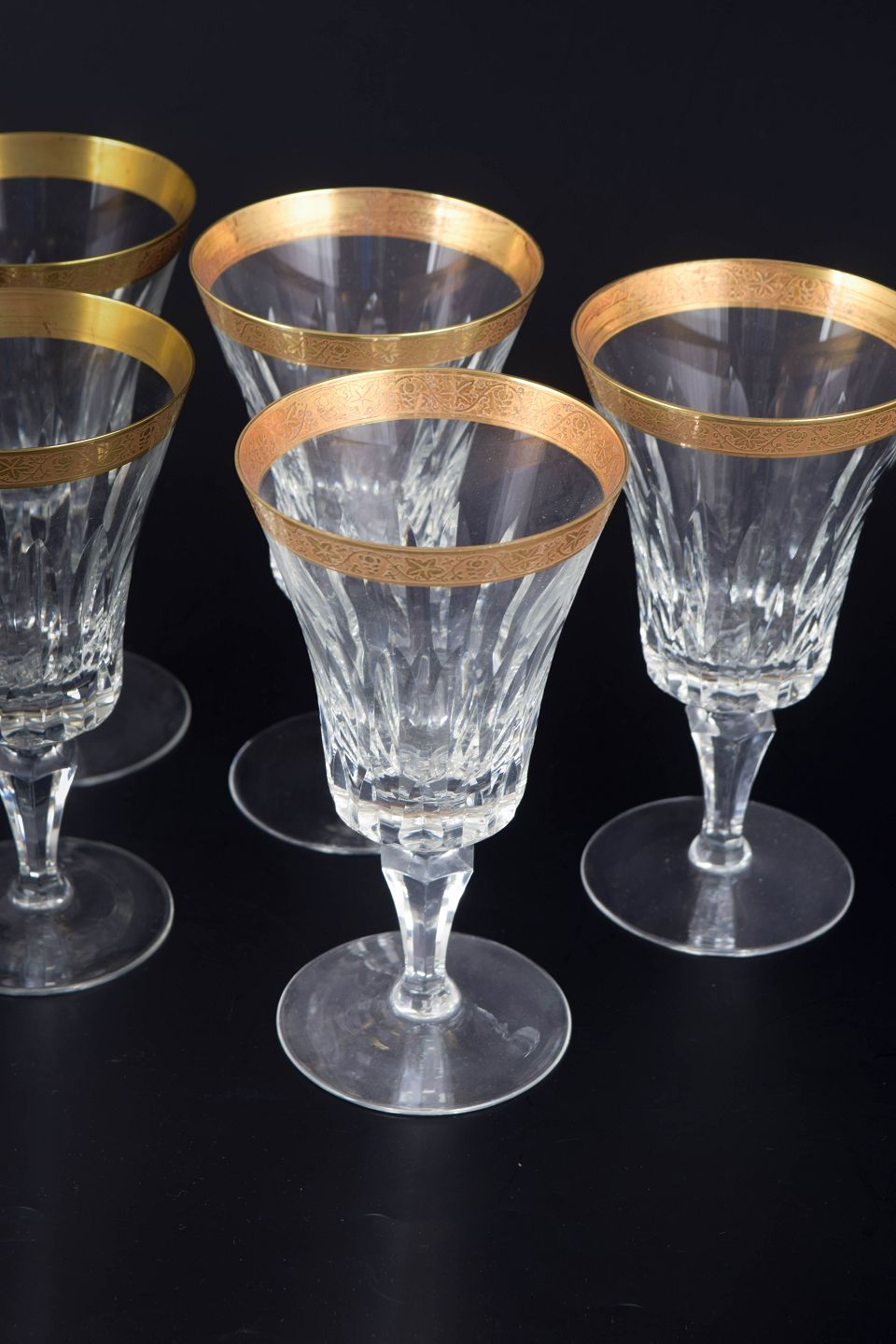 Elegante rødvinsglas i facetslebet krystal med dekoration i 24 karat guld langs kanten, udført i klassisk midten af det 20. århundrede stil.