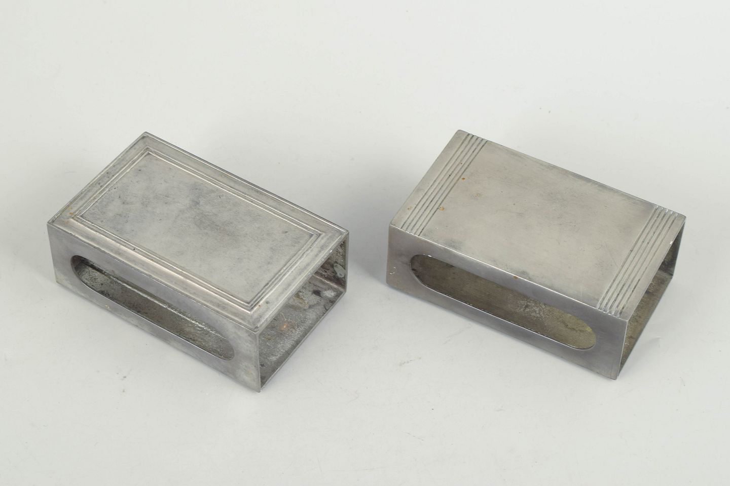 To tændstikæskeholdere i tin udført i et enkelt og stilrent art deco formsprog. Modeller 1496 og 1627.
