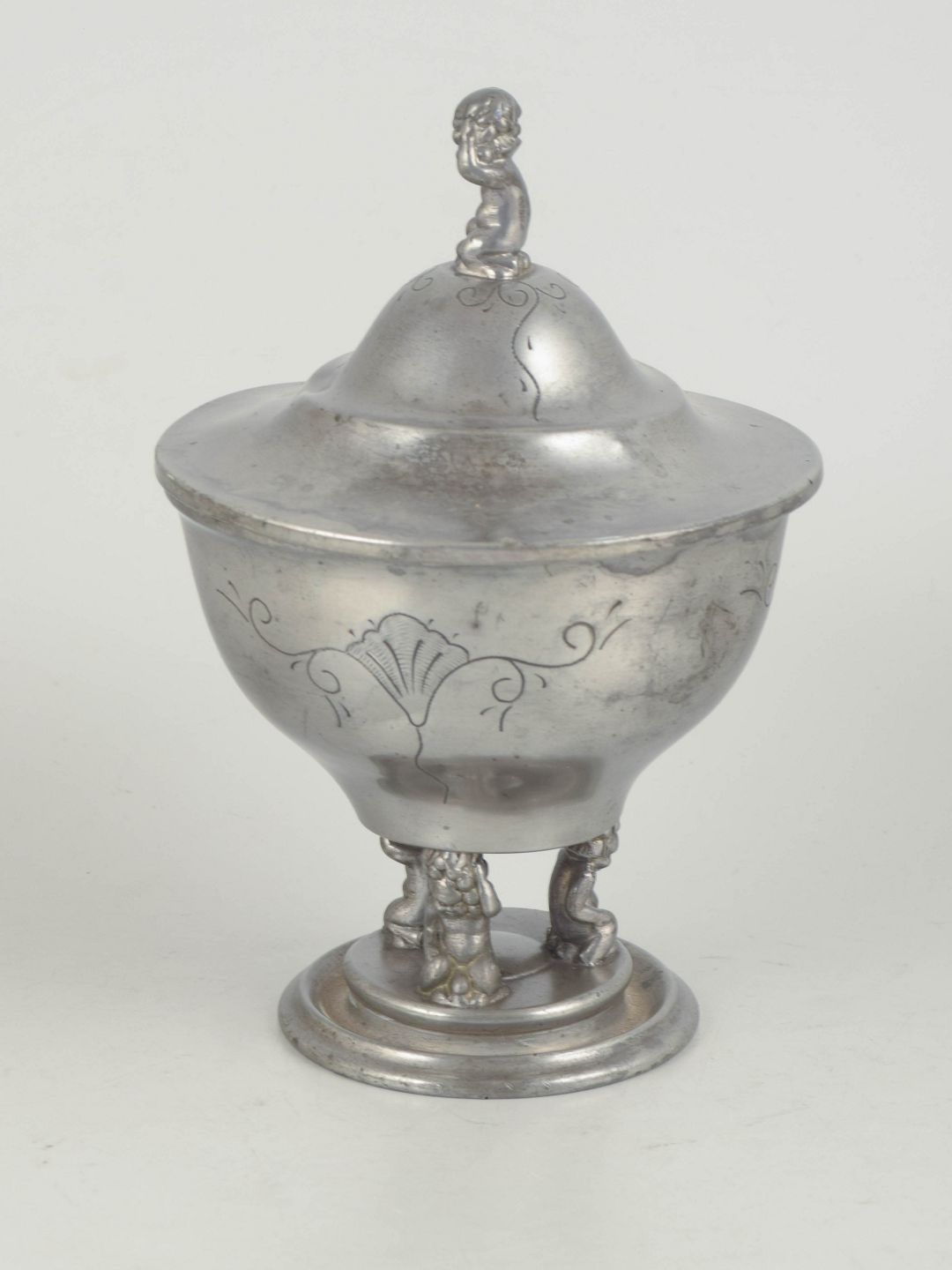 Dekorativ opsats i tin med låg og figurformet knop, udført med indgraveret dekoration og stående på tre små fødder.