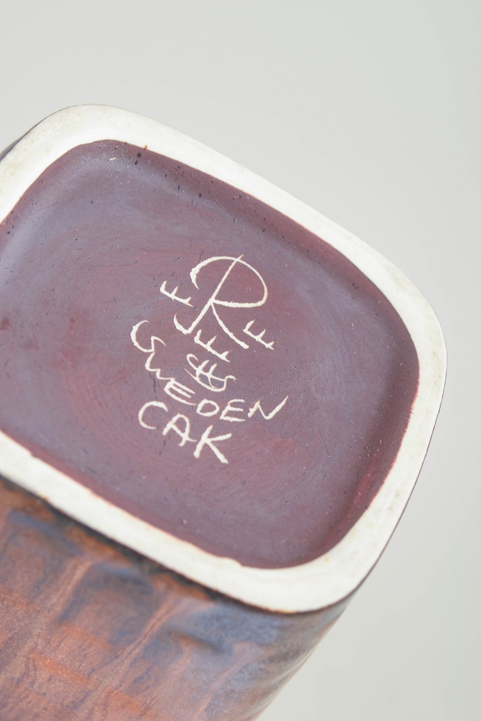 Stor, kantet vase i stentøj med markant rektangulær form og afrundede hjørner. Dekoreret med løbende glasur i varme brunlige og kobbertoner, der samler sig i mørkere nuancer mod bunden. Et kraftfuldt og dekorativt eksempel på Stålhane’s arbejde i større formater.