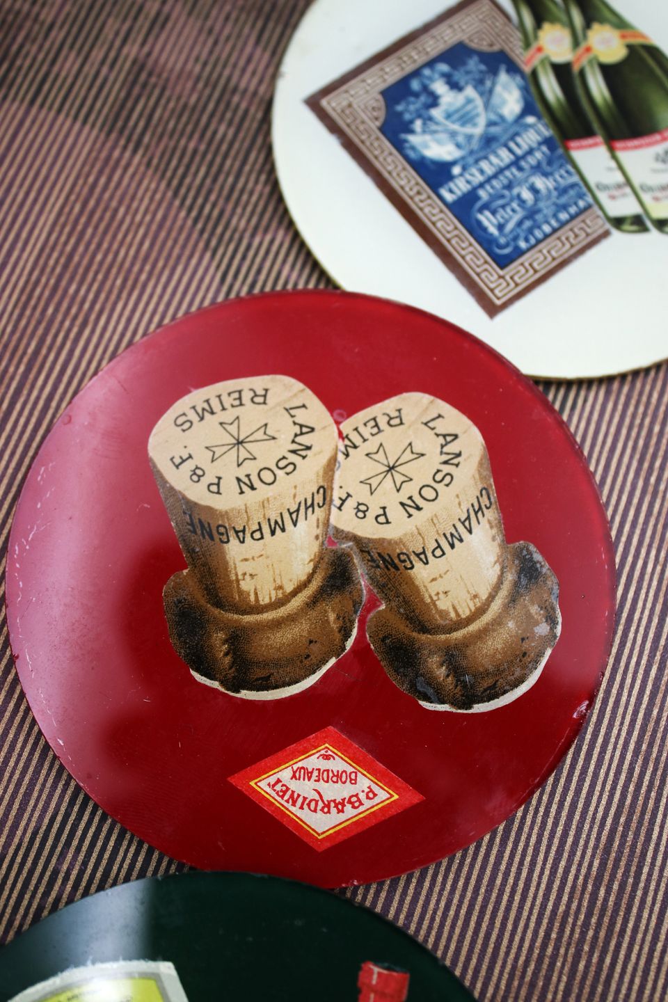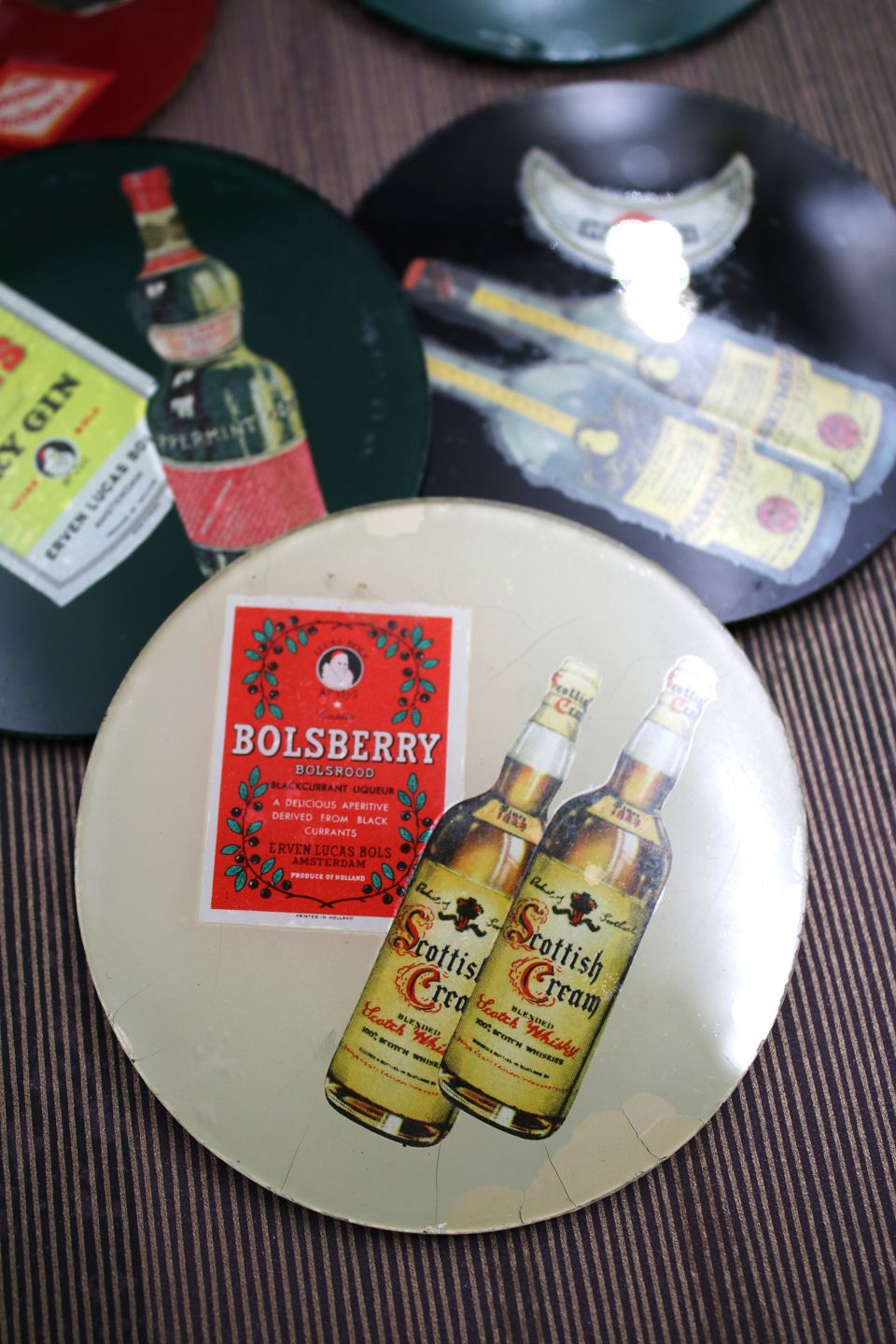 7 gamle drinks glasbakker med motiver af div. spiritus og likør mærker.