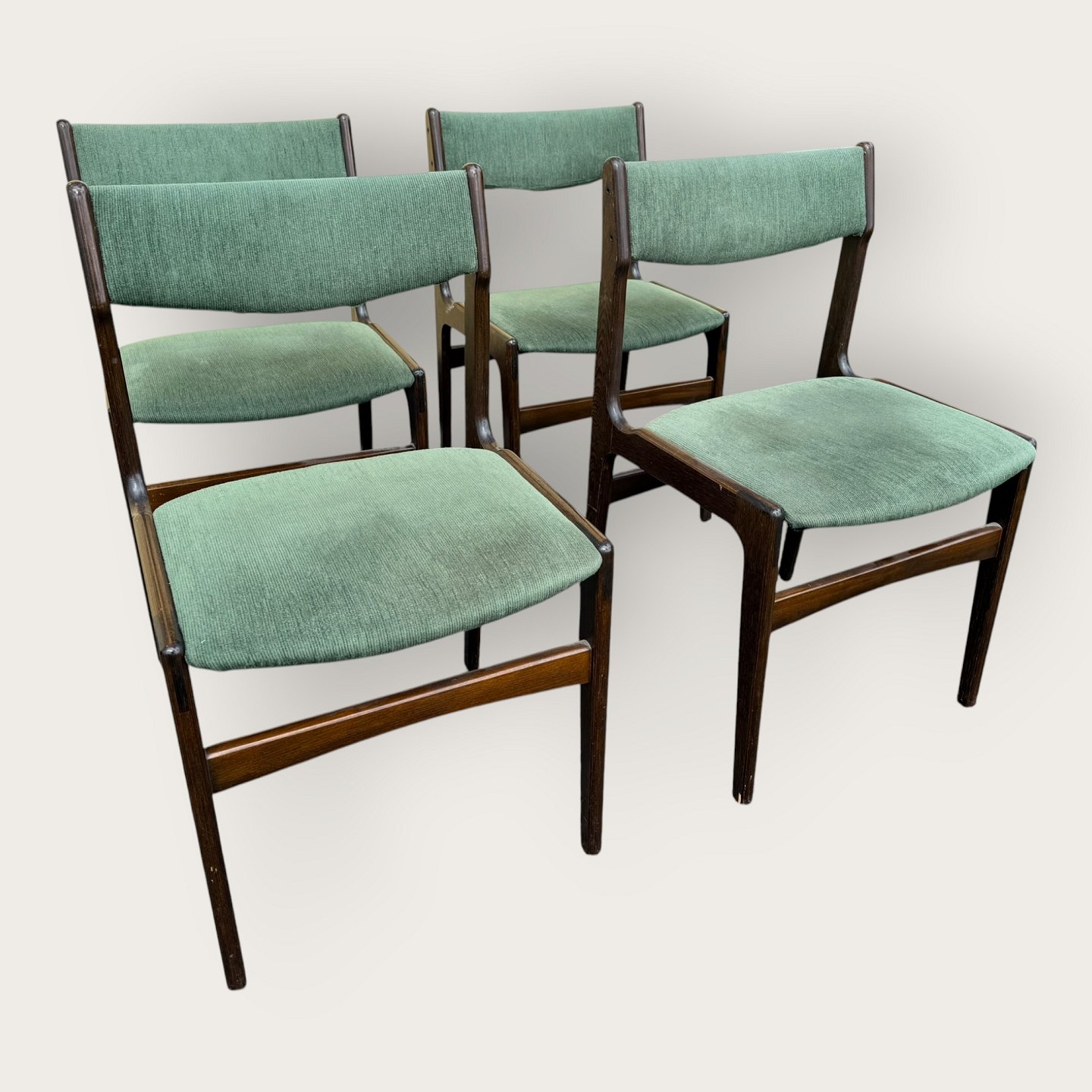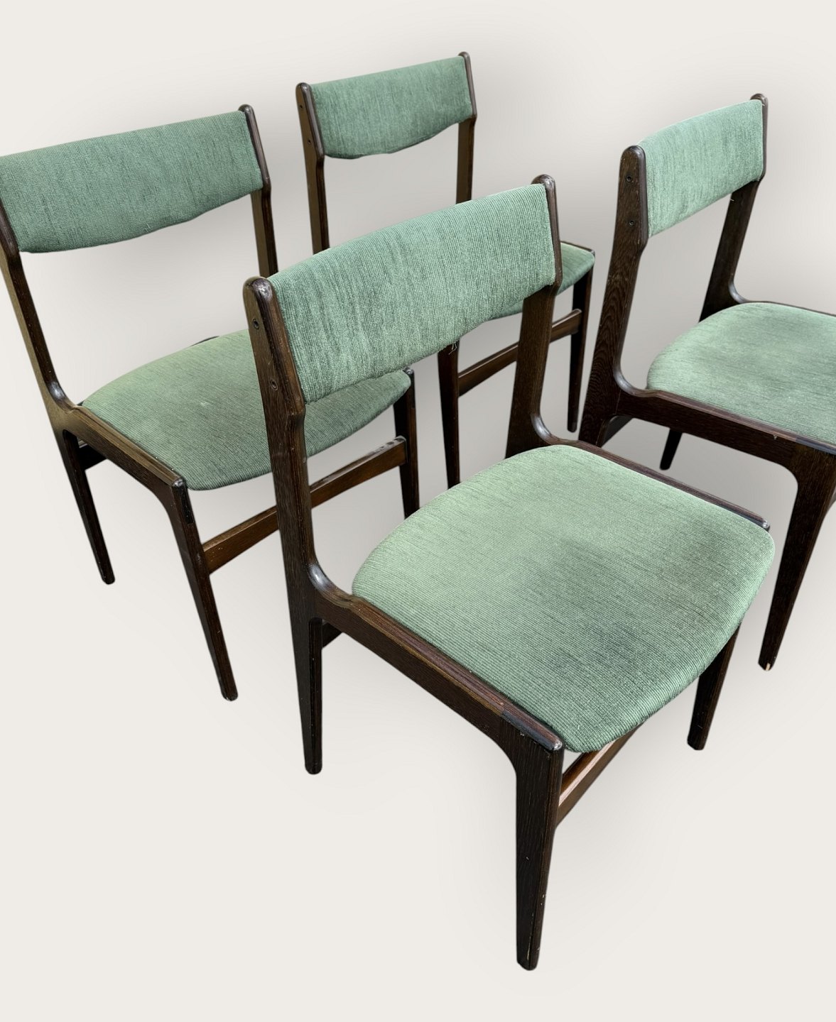 4 stole i mørkt bejdset træ, danish modern fra 1960'erne, stolene er stabile og i pæn brugt stand, men betrækket er plettet / løst.