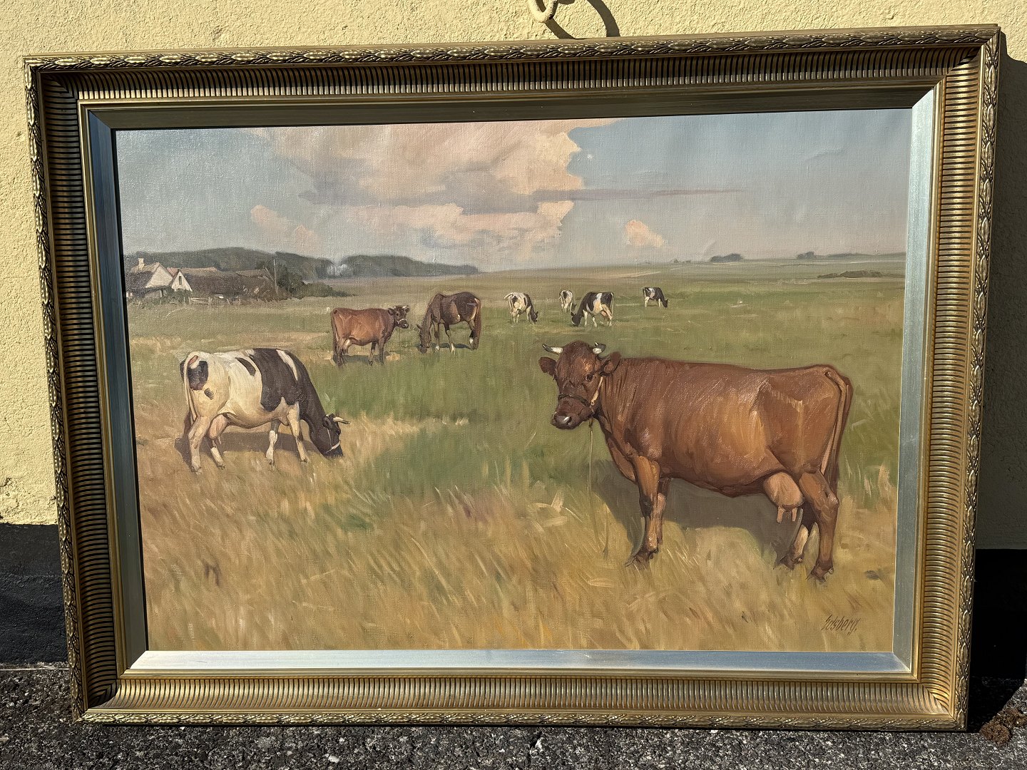 Knud Edsberg (1911-2003), Oil painting on canvas, cows in a field, Dimensions with frame 117x87 *Good condition with nice frame*