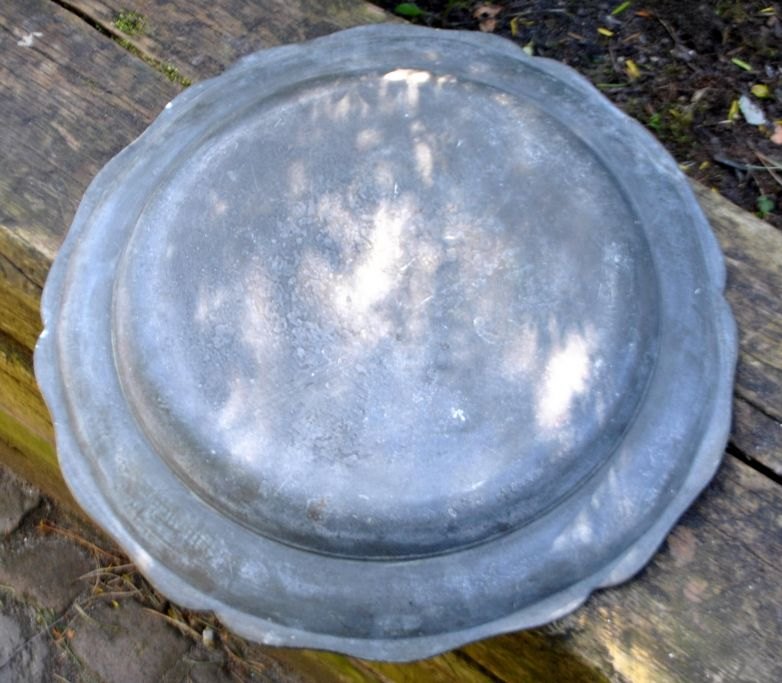 Stort 1700-tals tin rococofad. Fliget kant. Dia.: 37 cm. Ingen synlige stempler.