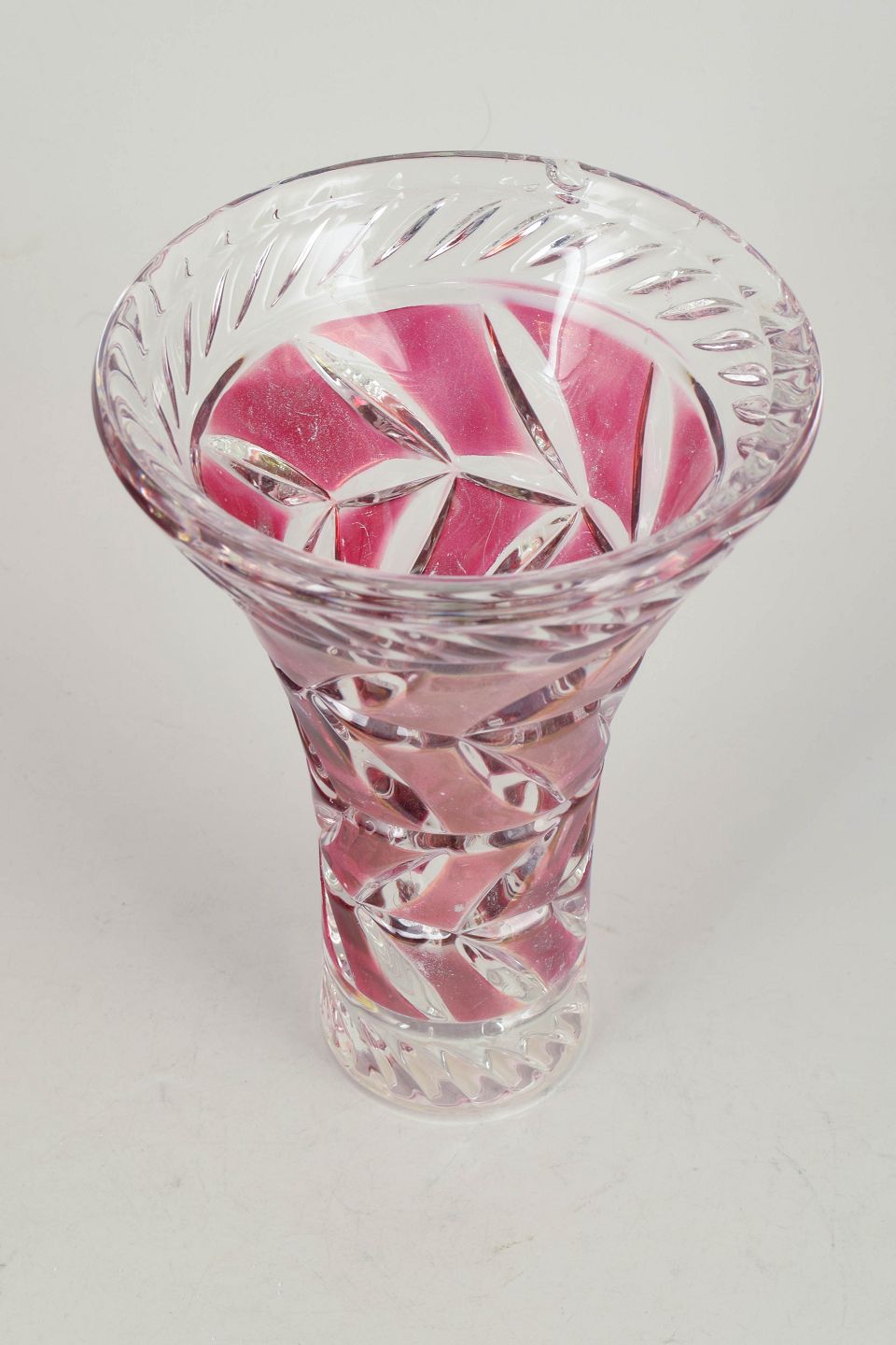 Presset og slebet krystal i klart og rosa tonet glas med spiralformet og geometrisk slebet dekor.