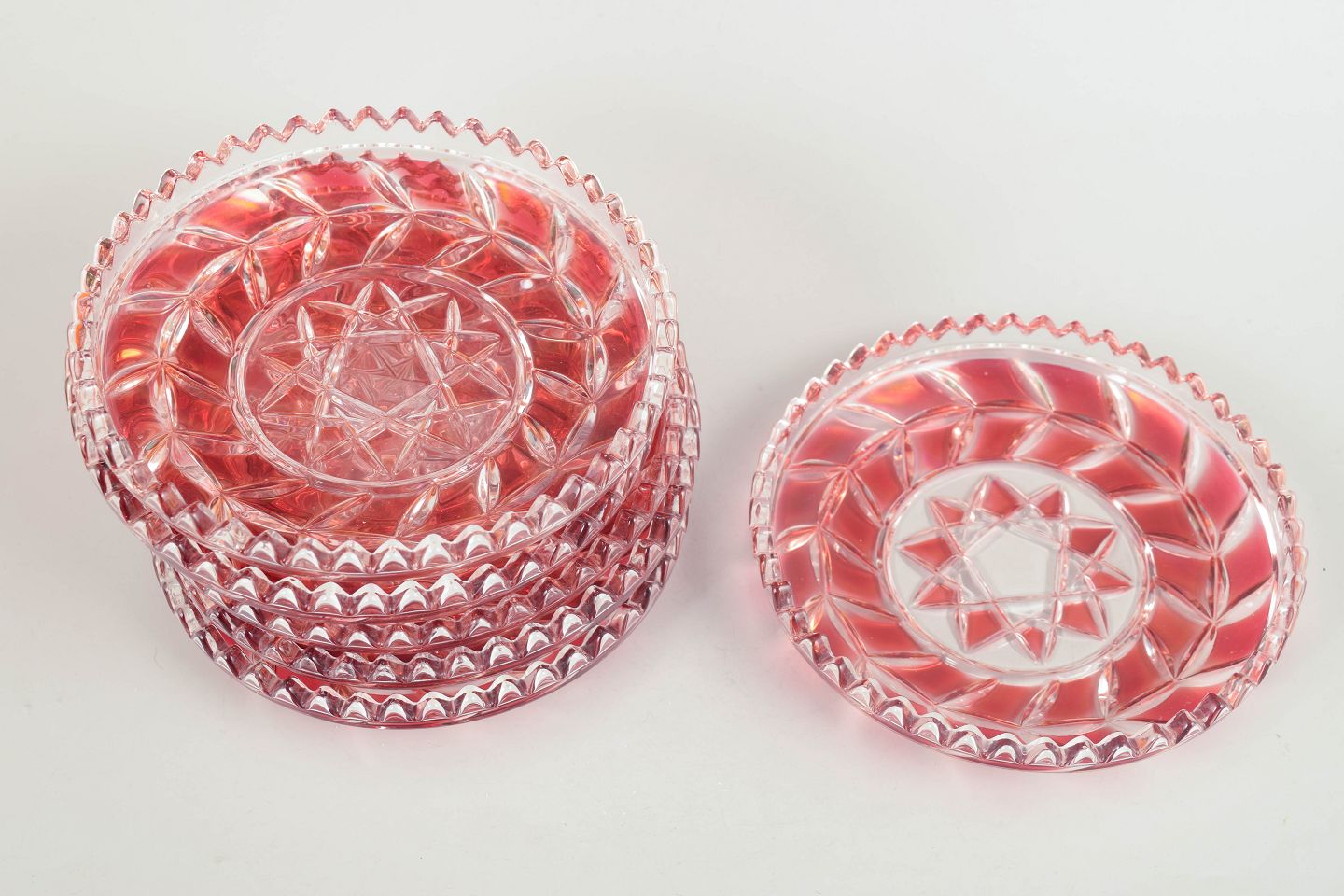 Pressede og slebne glasfade i klart og rosa tonet krystal med geometrisk stjernedekor og facetslebne kanter.