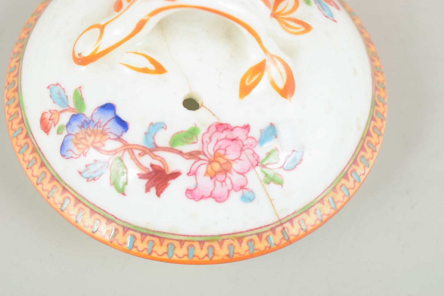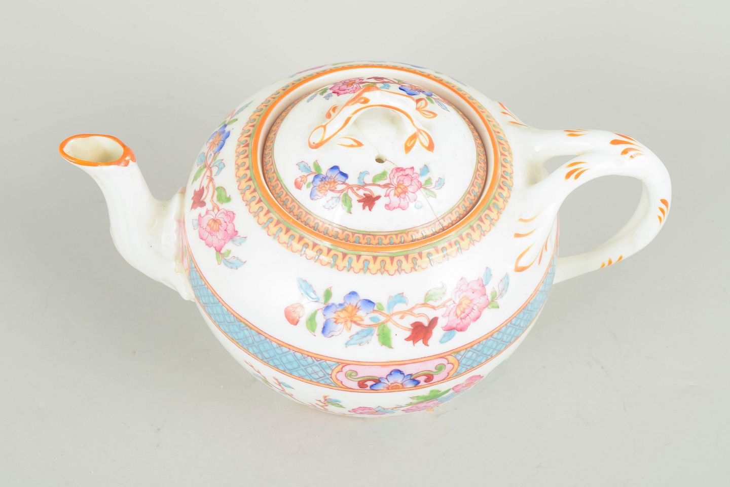 Dekoreret med polykrome blomster i orientalsk inspireret stil samt kantbort i turkis og guld. Låg med finial og buet hank, mærket under bunden.