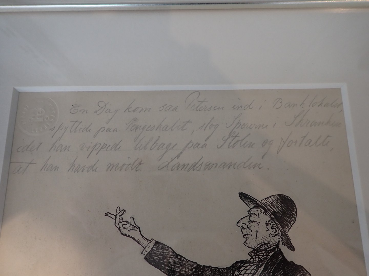 Indrammet original signeret Kaj Engholm 1924 (1906 - 1988) - tush tegning med hans egen blyantstekst: "En Dag kom saa Petersen ind i Banken, spyttede på Pengeskabet, slog Sporerne i Skranken idet han vippede tilbage paa Stolen og fortalte, at han havde mødt Landsmanden". Størrelse:17,5 x 24,5. I fin stand.