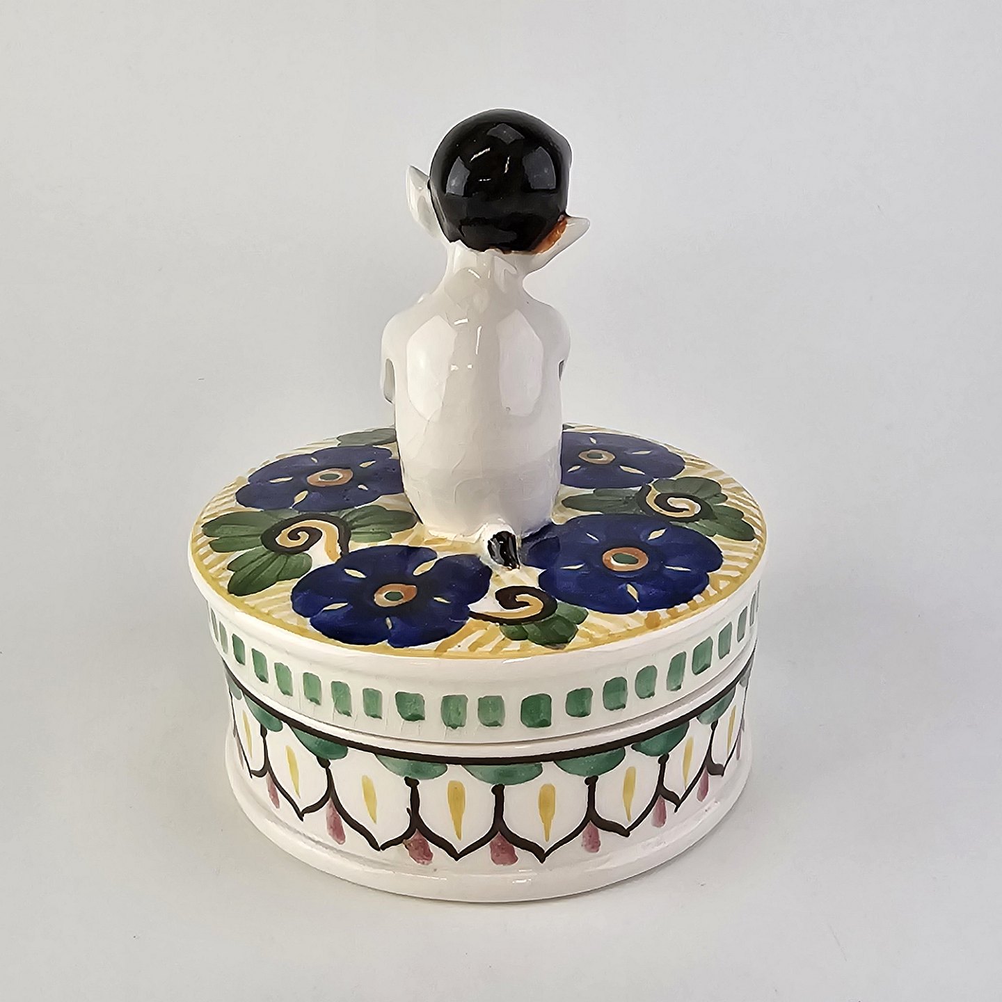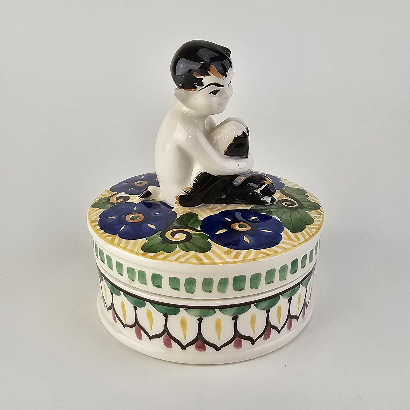 Krukke med låg i fajance med dekoration af blomster og en figur af en faun på låget