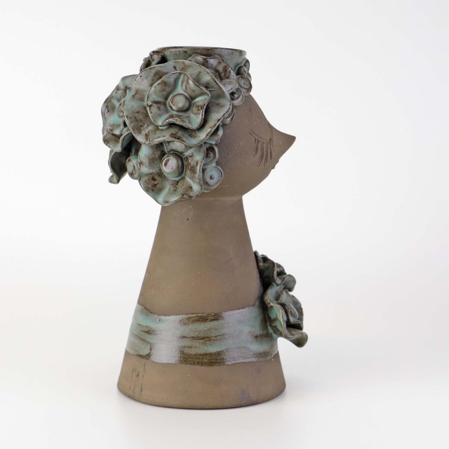 Vase i delvist glaseret keramik med motiv af Thurøpige med grønlig glasur.