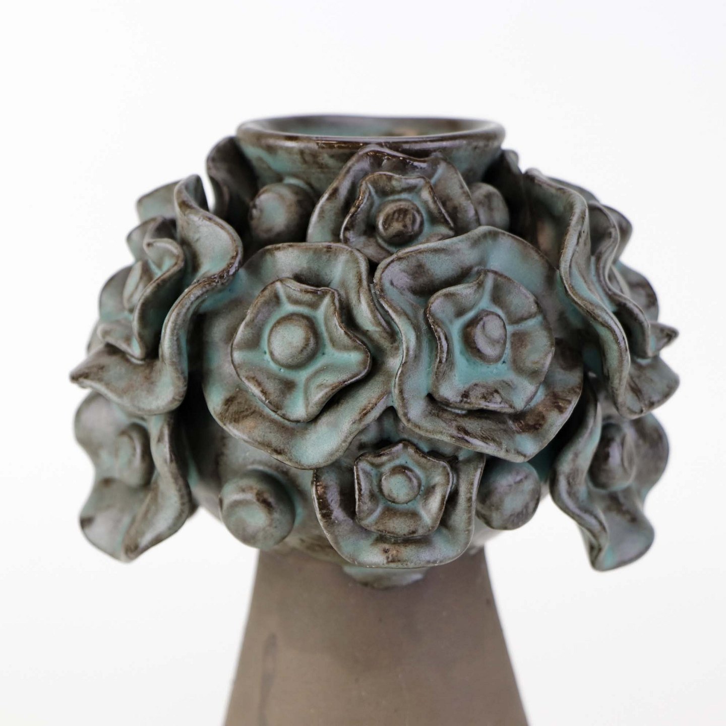 Fremstår med brugsspor på uglaseret keramik samt mindre nøk ved en blomst.