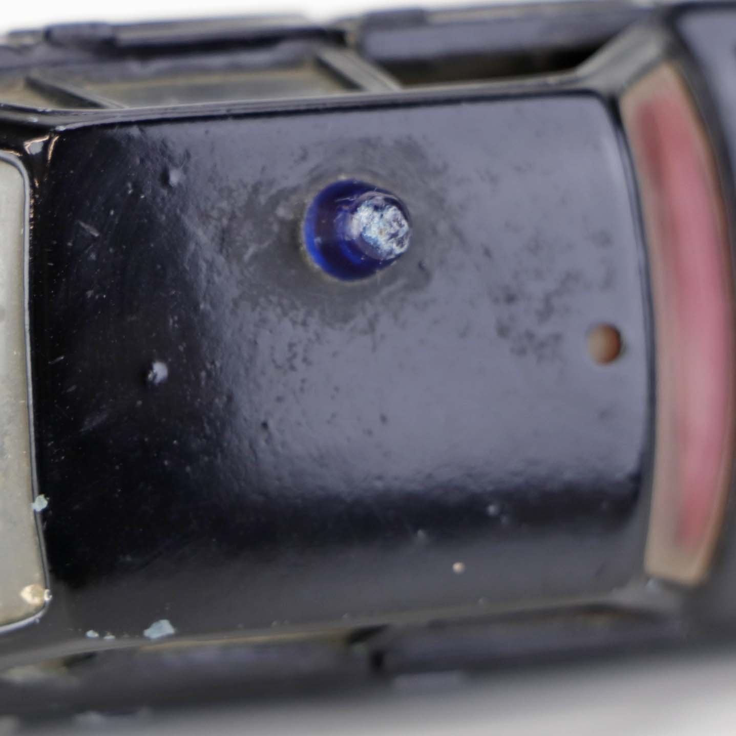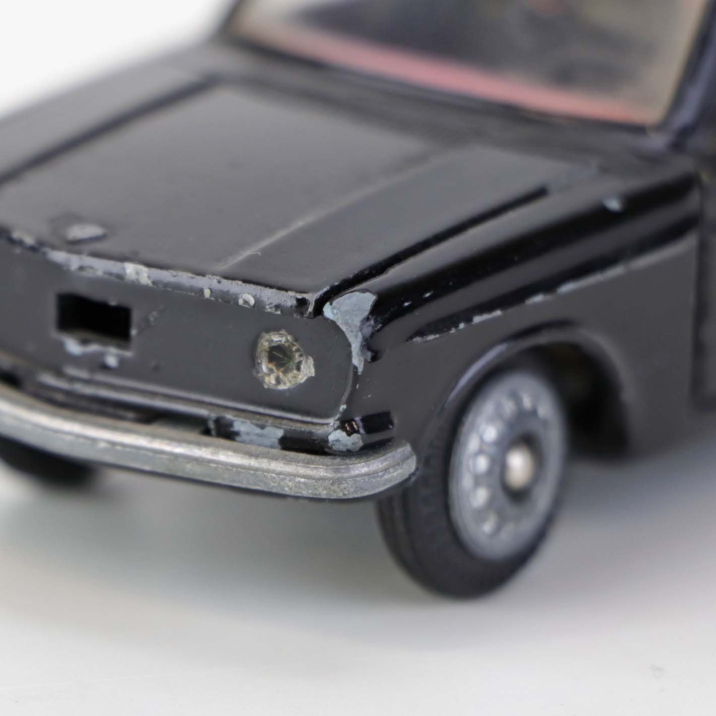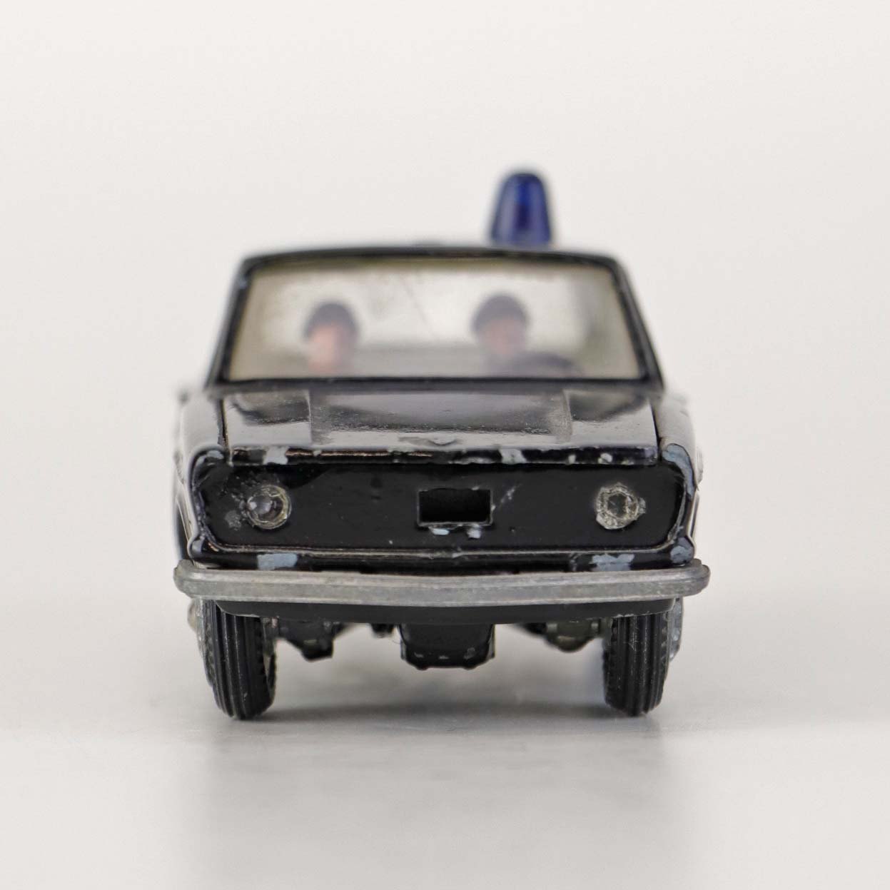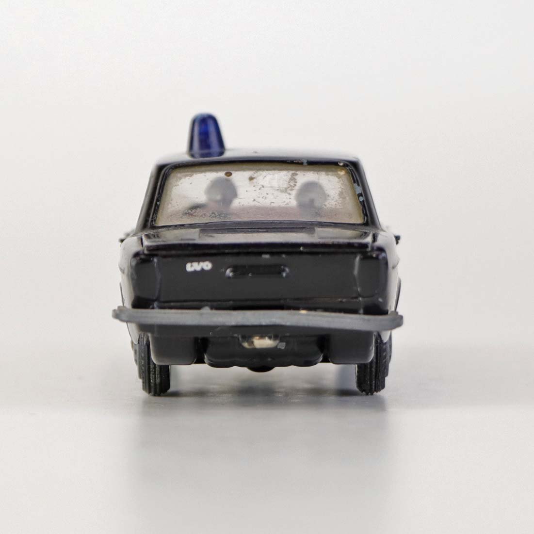 Politibil med to figurer. Legetøjsbil i sortlakeret metal med gummi hjul og blå blinklys. Model Volvo 144