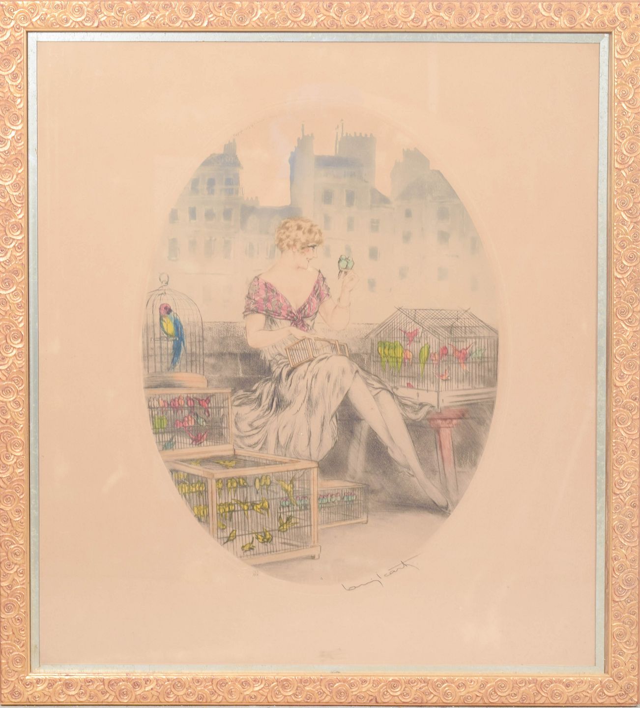 Elegant og dekorativ komposition med en siddende kvinde omgivet af fuglebure, udført i Icart’s karakteristiske Art Deco stil med fine linjer og lette farvelægninger. Signeret i blyant.
