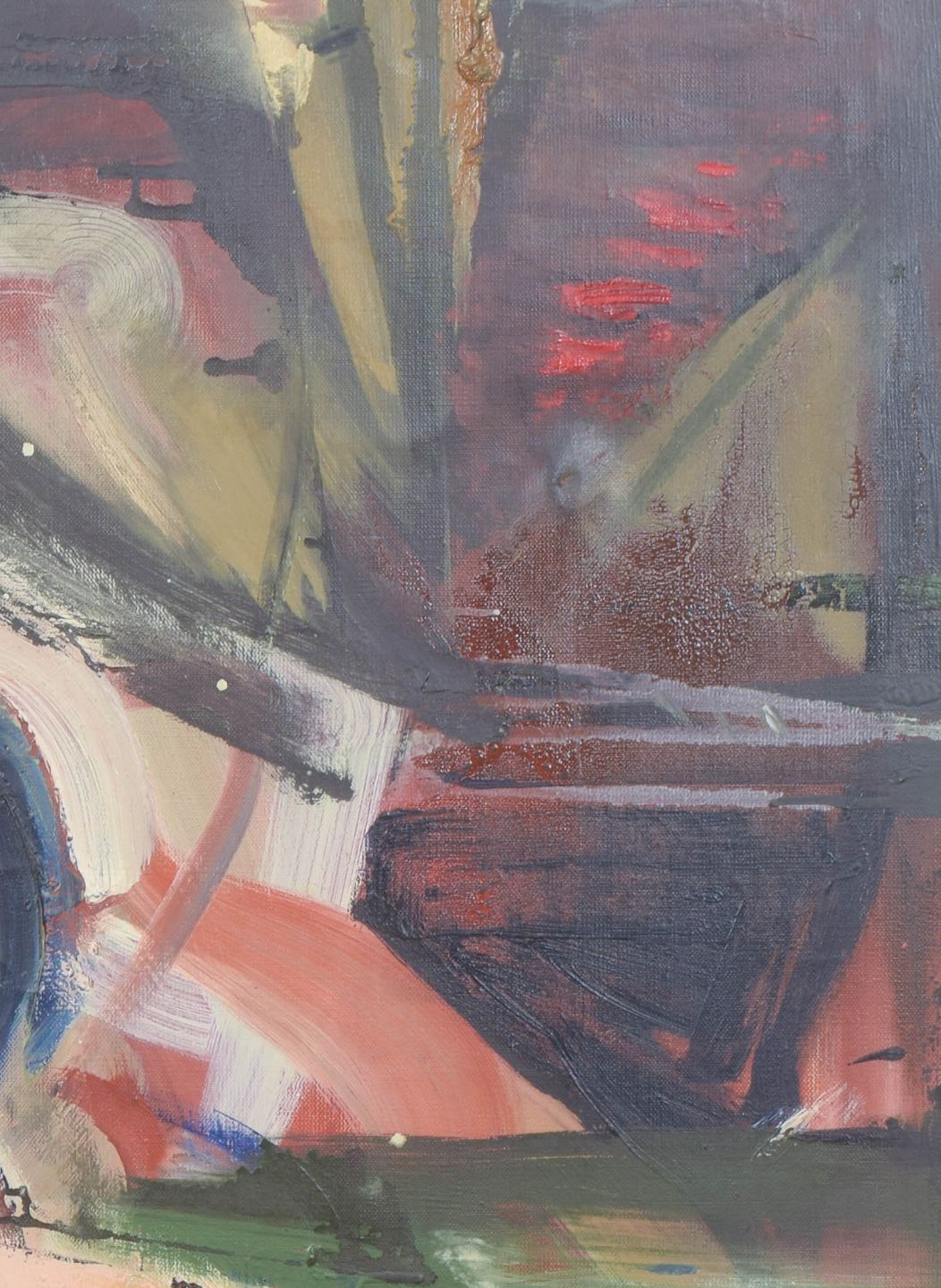 Expressive modernist composition with dynamic brushwork and fragmented geometric forms rendered in a vivid palette. The structure suggests architectural elements and spatial tension, executed with a free and gestural approach. Oil on canvas, unsigned.