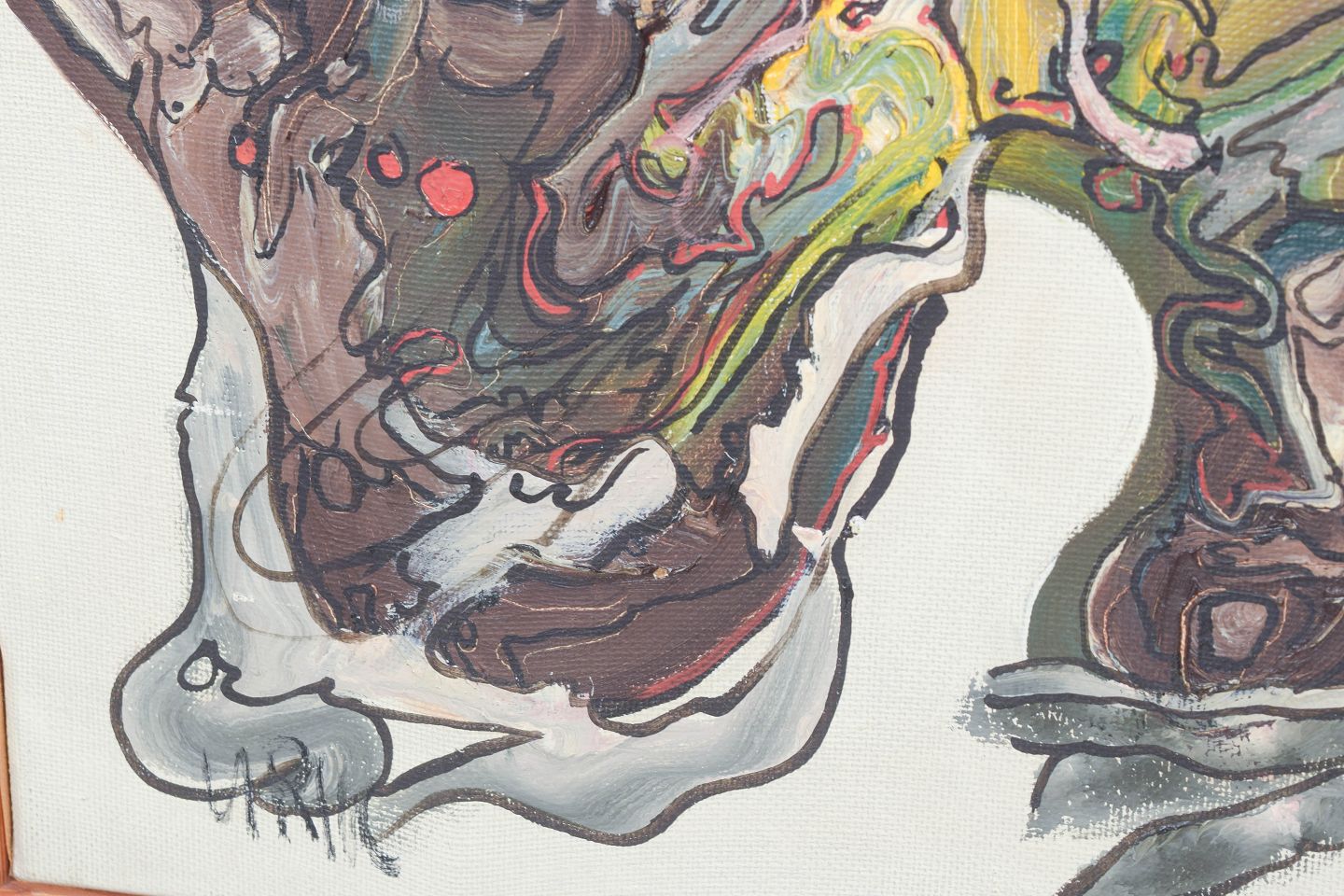 Abstrakt og ekspressivt komposition med organiske, næsten biomorfe former og komplekse lag af farve i dybe røde, blå og jordede toner. Dynamisk opbygning med flydende konturer og en intens, gestisk penselføring, signeret.