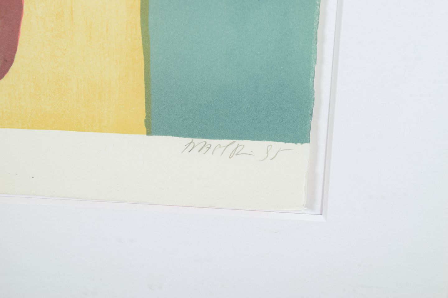 Abstrakt komposition med svævende organiske former og dekorative elementer i bløde farveovergange, udført som farvelitografi, signeret og nummereret 106/150, dateret 1995.