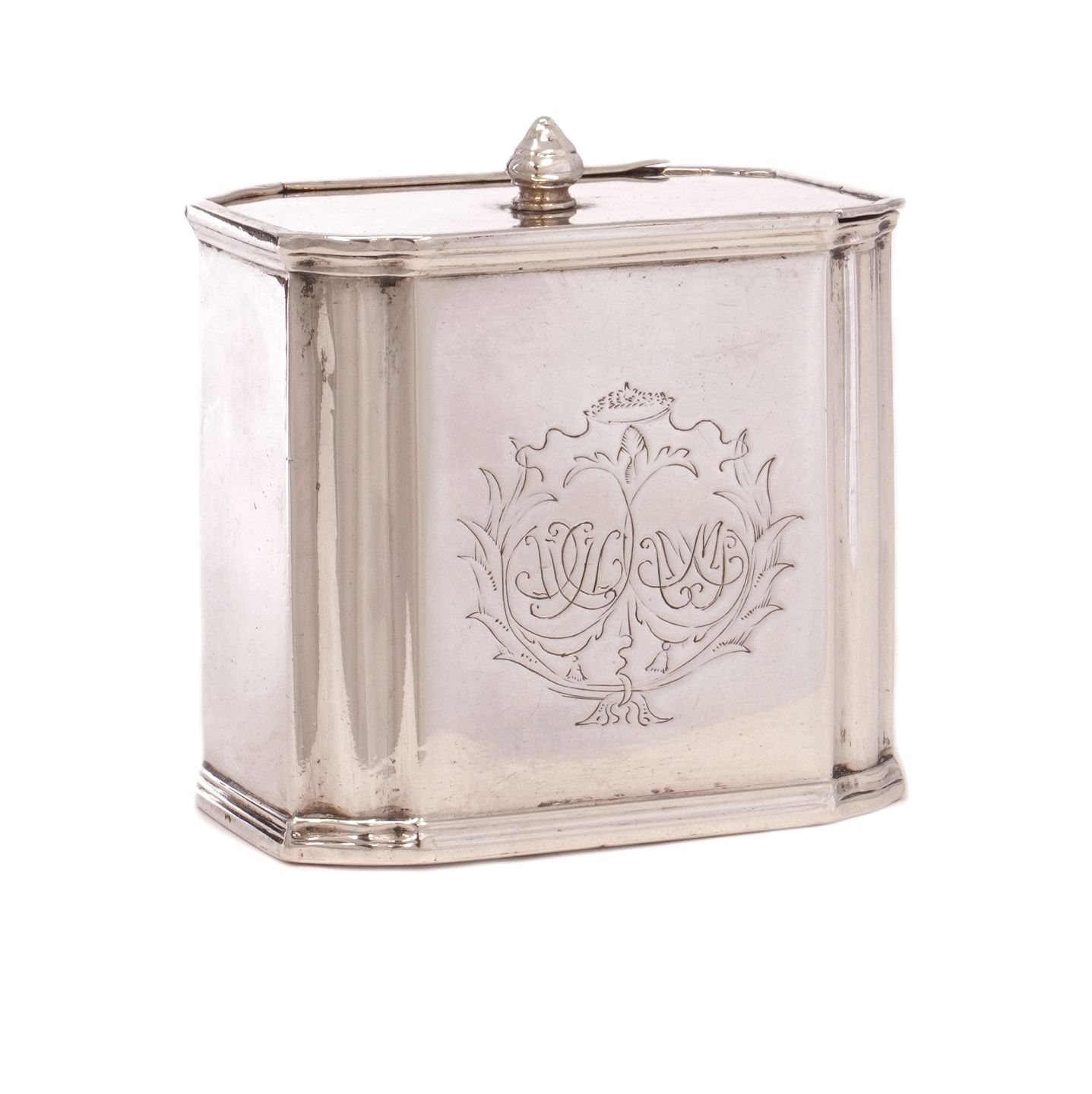Sjælden Regence tedåse med skydelåg i sølv udført af Johan Mehl, Viborg, 1725-65. H: 8cm. B: 7,7cm