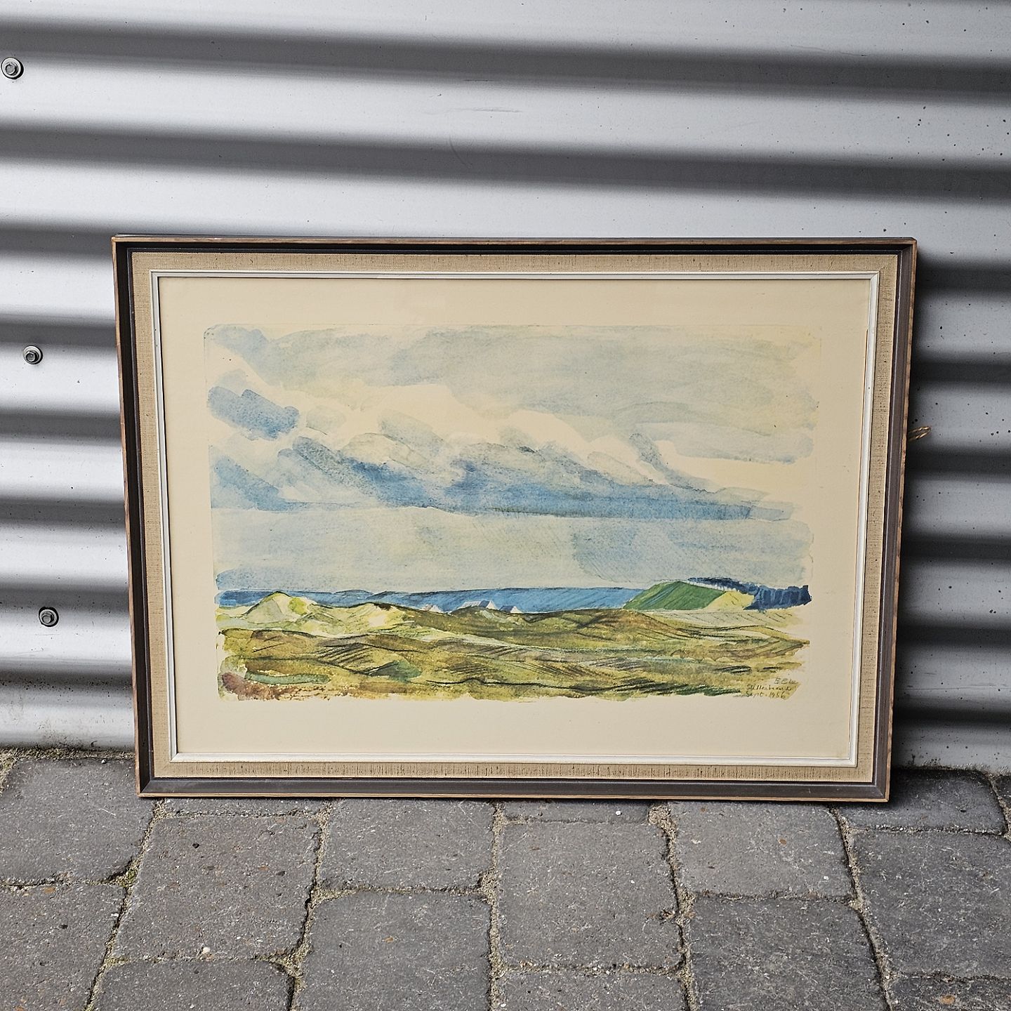 Akvarel maleri på papir med motiv af Slettestrand. Monteret i sortmalet træramme, dateret 1956