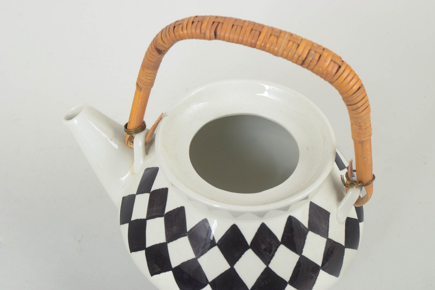 Klassisk tekande i porcelæn med karakteristisk sort rudemønster og buet hank i flettet rør, et markant eksempel på svensk funktionalistisk design fra perioden.
